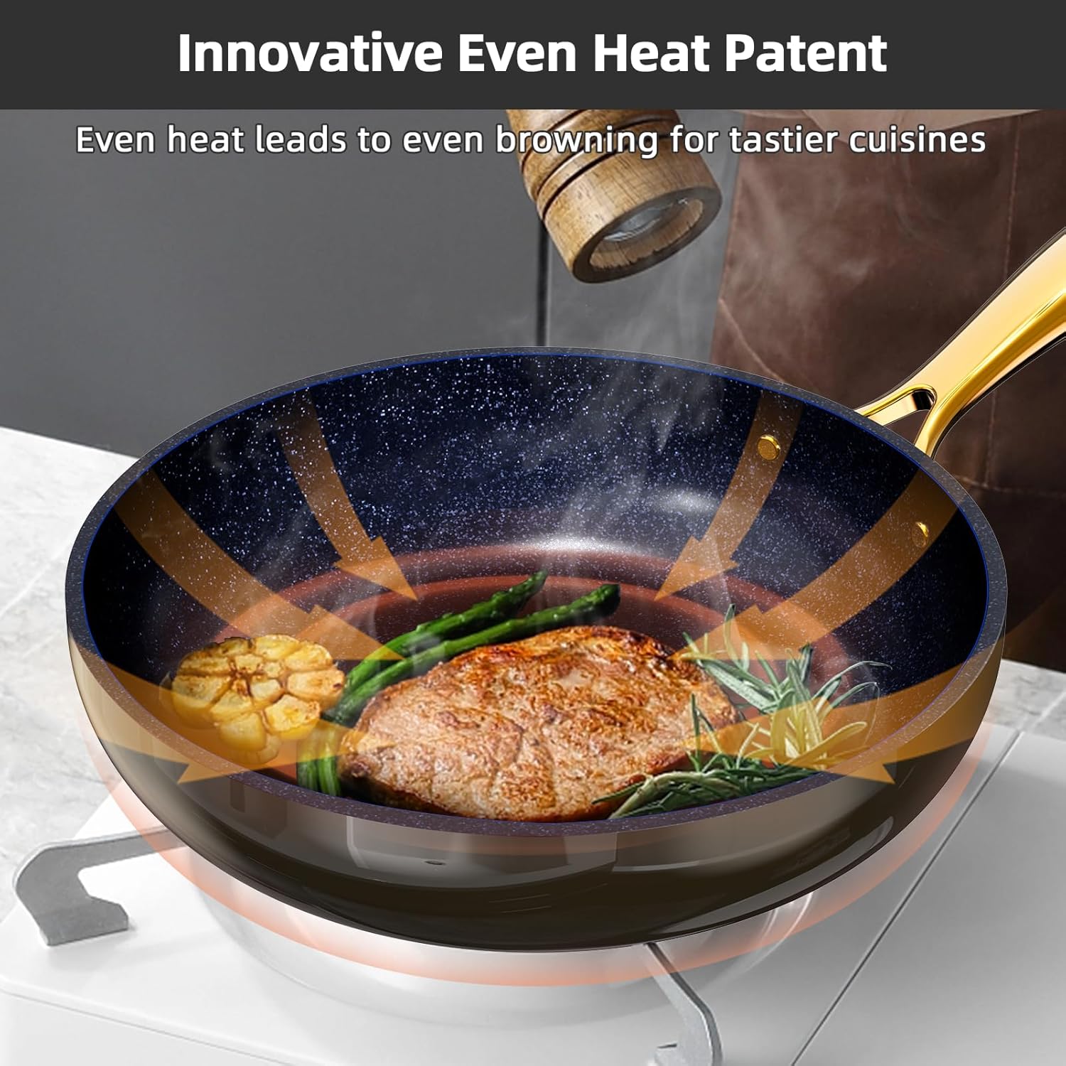 - LUXURIOUS GOLD HANDLES – Add a touch of elegance to your kitchen. Our ergonomic stay-cool handles are finished in a lustrous gold color to give your kitchen décor an extra spark. Each handle contains a built-in heat diffuser to keep the grip cooler.