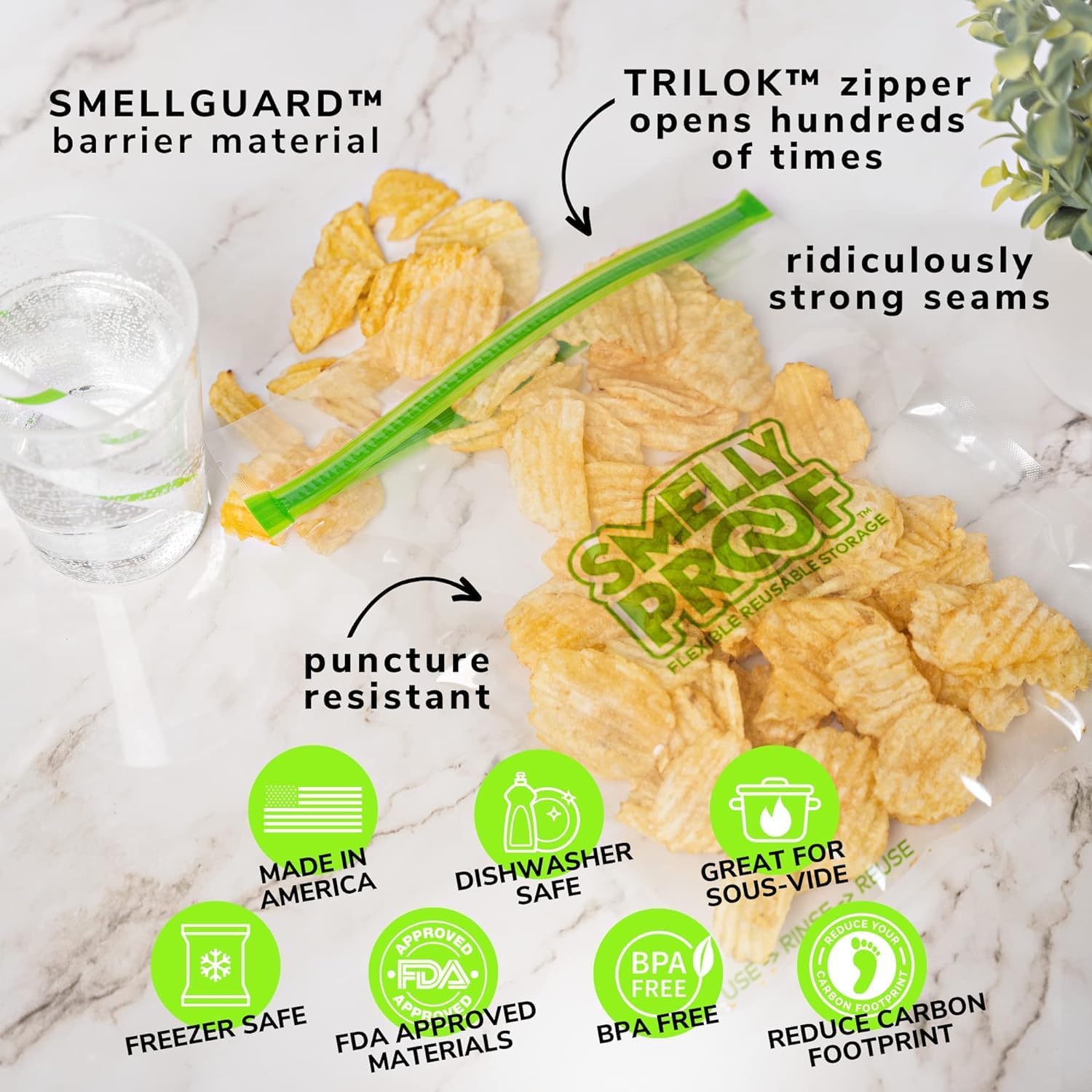 Smelly Proof 50pk Reusable Food Storage Bags - Made in USA, Dishwasher-Safe, BPA FREE, NO PEVA, Clear FLAT Large 3-mil Thick, 8.5" x 10"