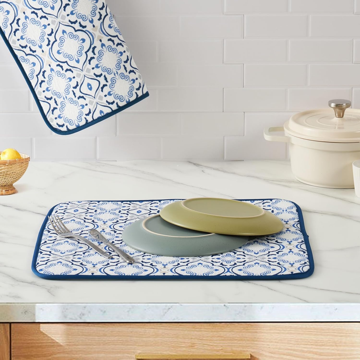 FRESHMINT Printed Dish Drying Mats for Kitchen Counter 2 Pack Absorbent Reversible Drying Mats Microfiber Kitchen Countertop Protector Dishes Drying Pad Extra Large 18"x24" Dish Mat