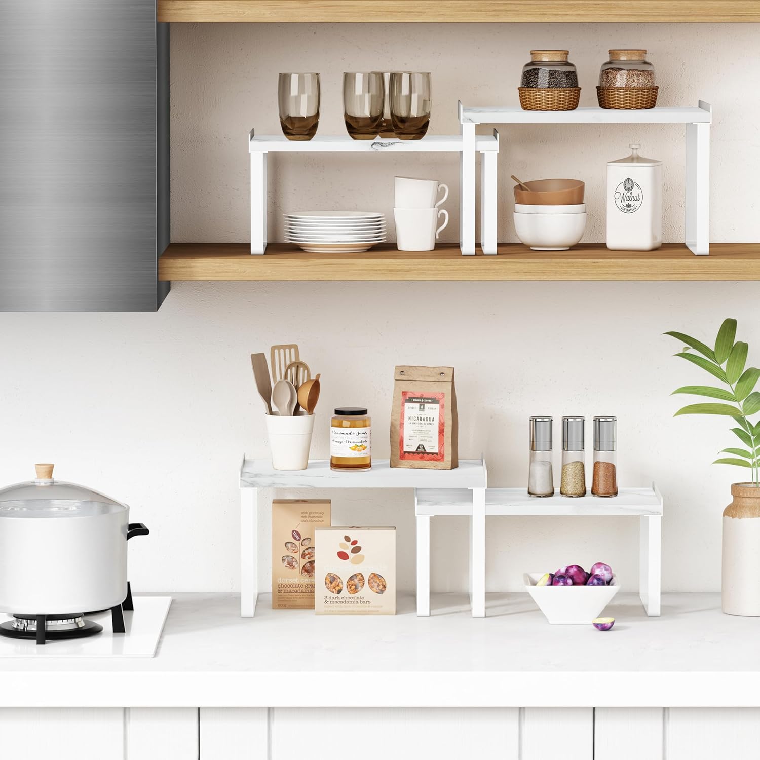 White Marble Kitchen Counter Shelf Organizer, Modern Dish Plate Organizer for Cabinet Space Saver, Small Wood Stackable 2 Tier Office Desktop Shelf Risers for Books Monitor - Set of 4