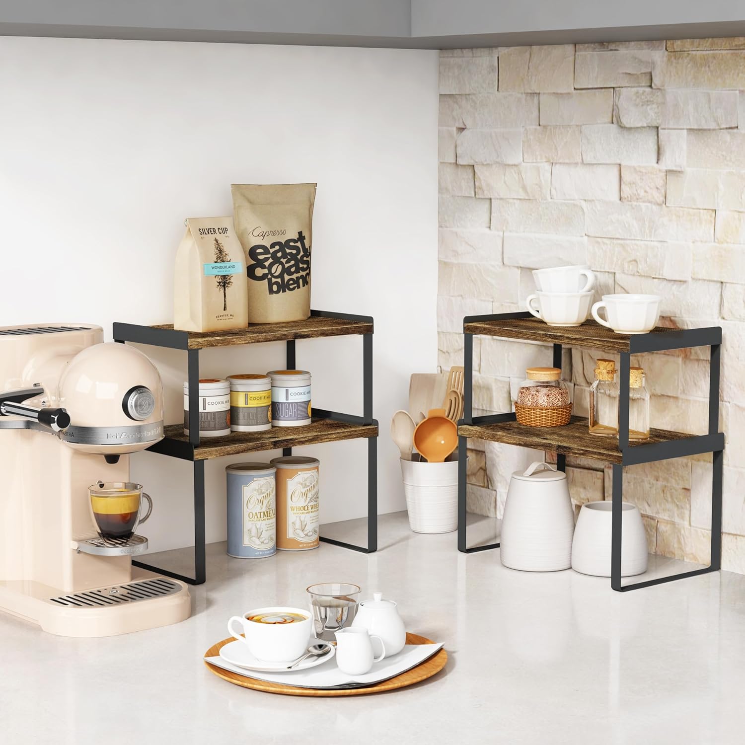 - 【Versatile Shelf Riser Organizer】This kitchen counter shelves are useful kitchen organization and storage tools to organizer messy items in your cabinet, pantry, cupboard, kitchen counter corner, coffee bar, etc. The shelf organizer can also be used outside the kitchen, as table shelf stand for your monitor on home office and so on.