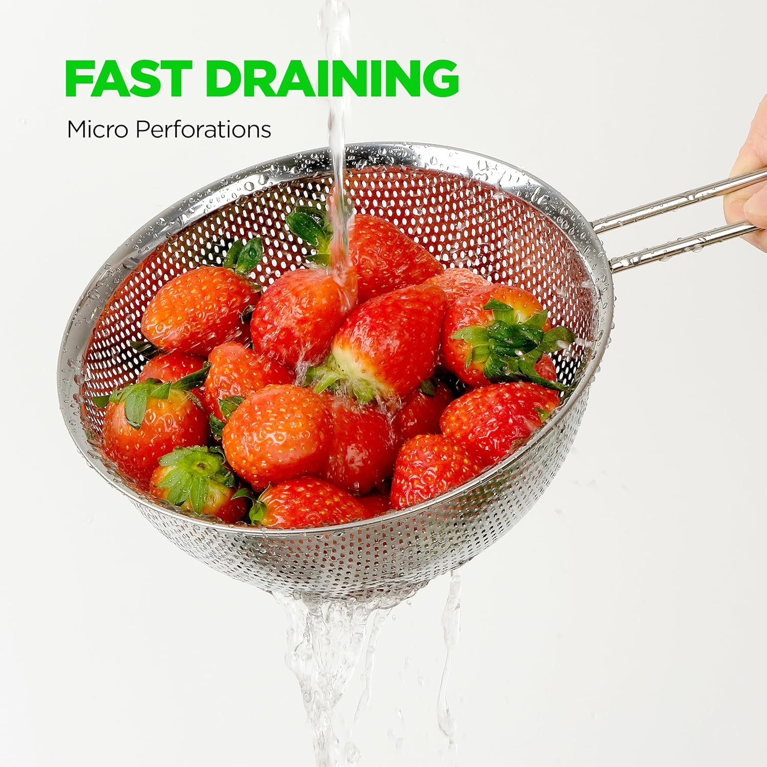 - MICRO-PERFORATED FOR EFFICIENCY: Designed with micro-perforations, our colander offers superior durability and efficiency over traditional designs. Perfect for washing a variety of foods, its high-quality 304 stainless steel construction ensures long-lasting performance. The fine perforations allow for efficient drainage, making it a practical addition to any kitchen.