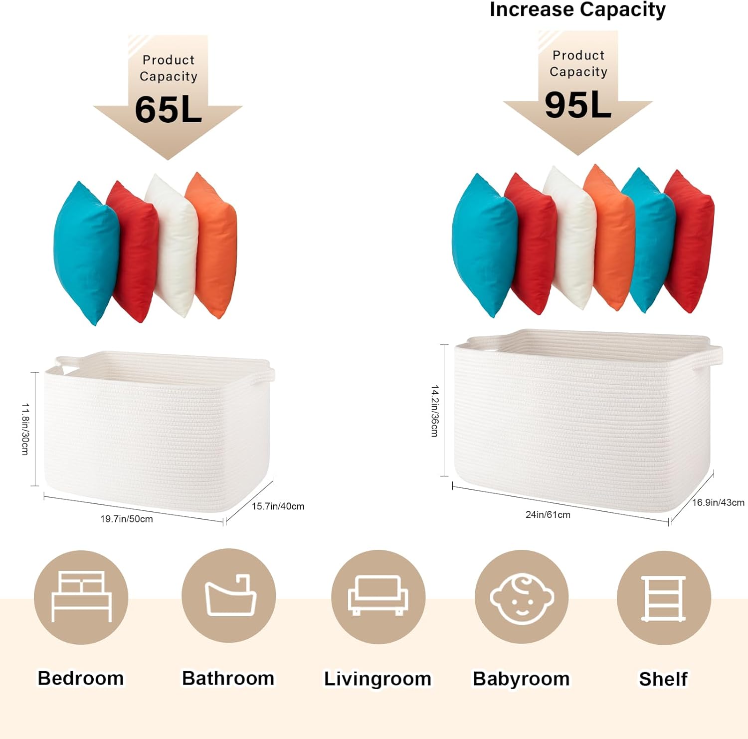 65L Large Storage Basket, Cotton Rope Woven Blanket Basket, Toy Storage for Baby Room, Living Room, White