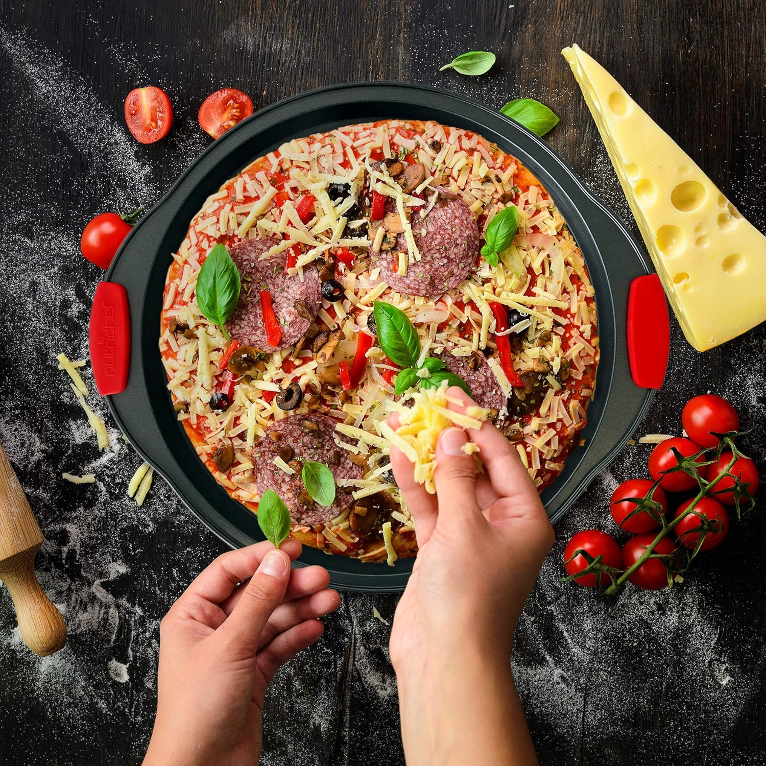 NutriChef Premium 10-Piece Bakeware Set - Flexible Nonstick Carbon Steel, Stylish Red Silicone Handles, Oven Safe Up to 450°F, Dishwasher Safe, Ideal for Baking Cakes, Muffins & More