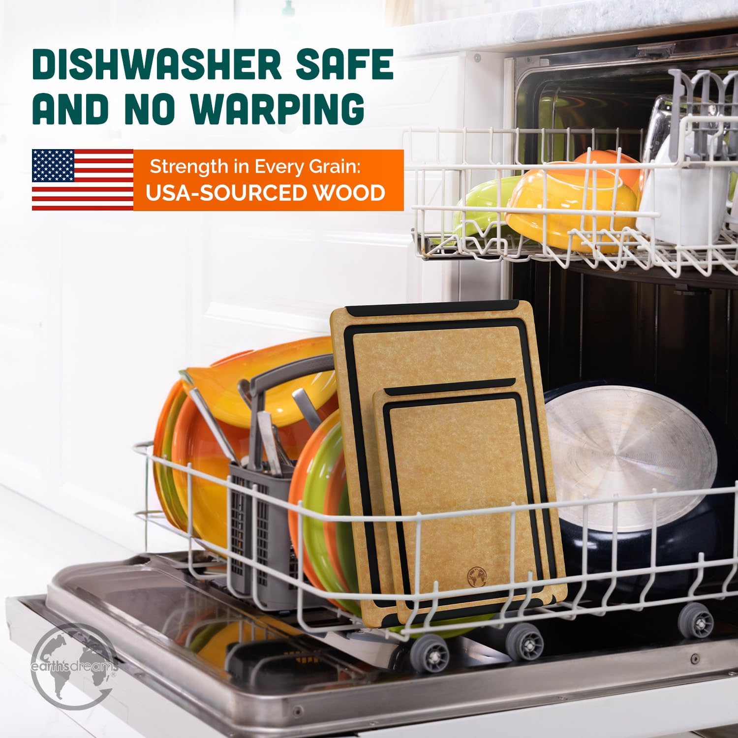 - CUTTING BOARDS DISHWASHER SAFE - Keeping your cutting boards clean can be quite challenging. However, with our cutting boards set, it is not. The cutting boards are made with non toxic materials are designed to be dishwasher-safe & non porous unlike Bamboo Cutting Boards, which are oftentimes non hygienic and not dishwasher friendly.