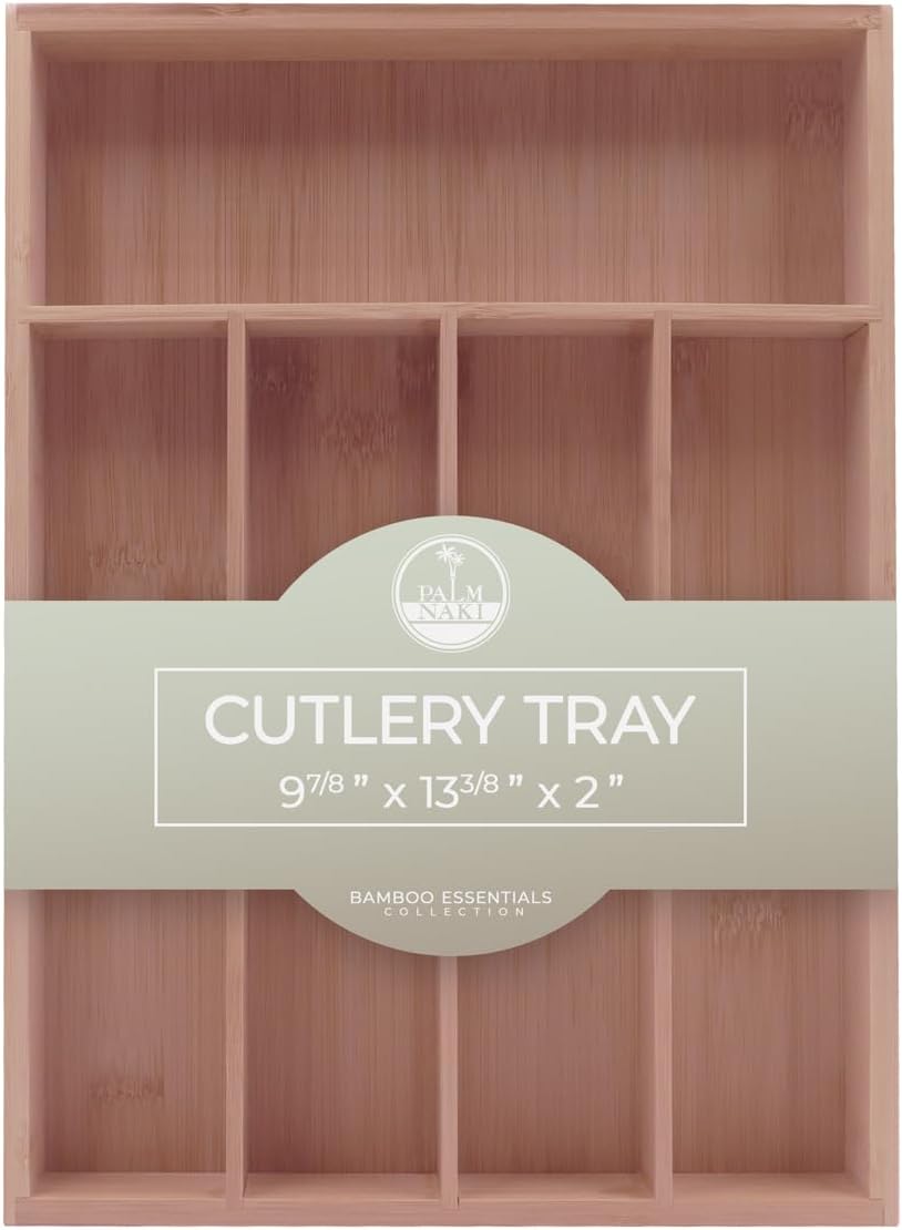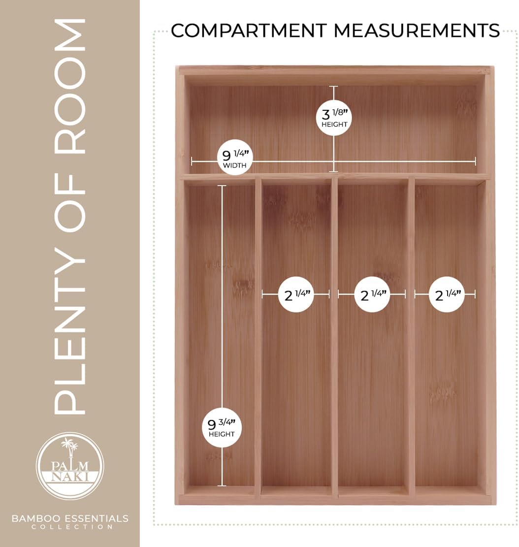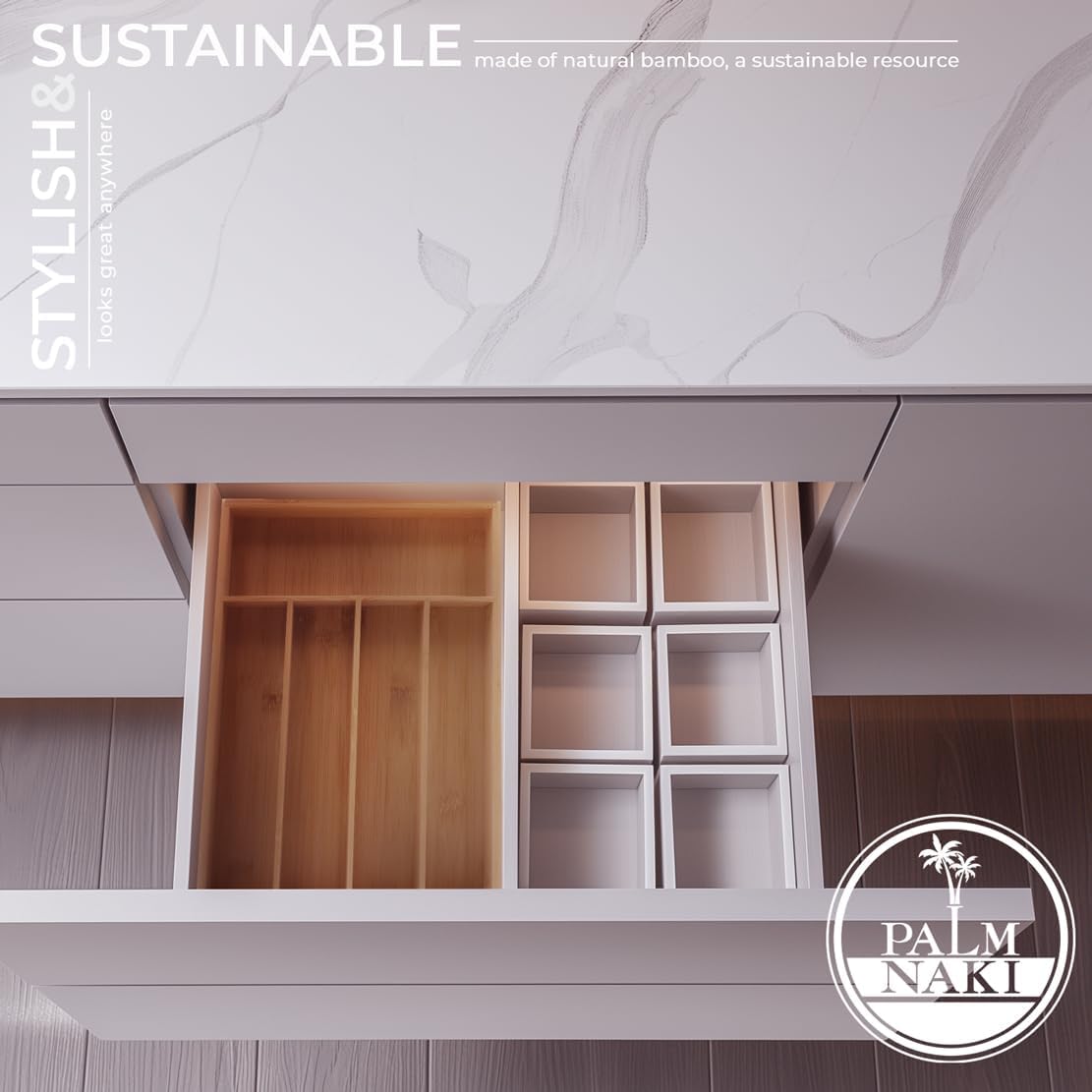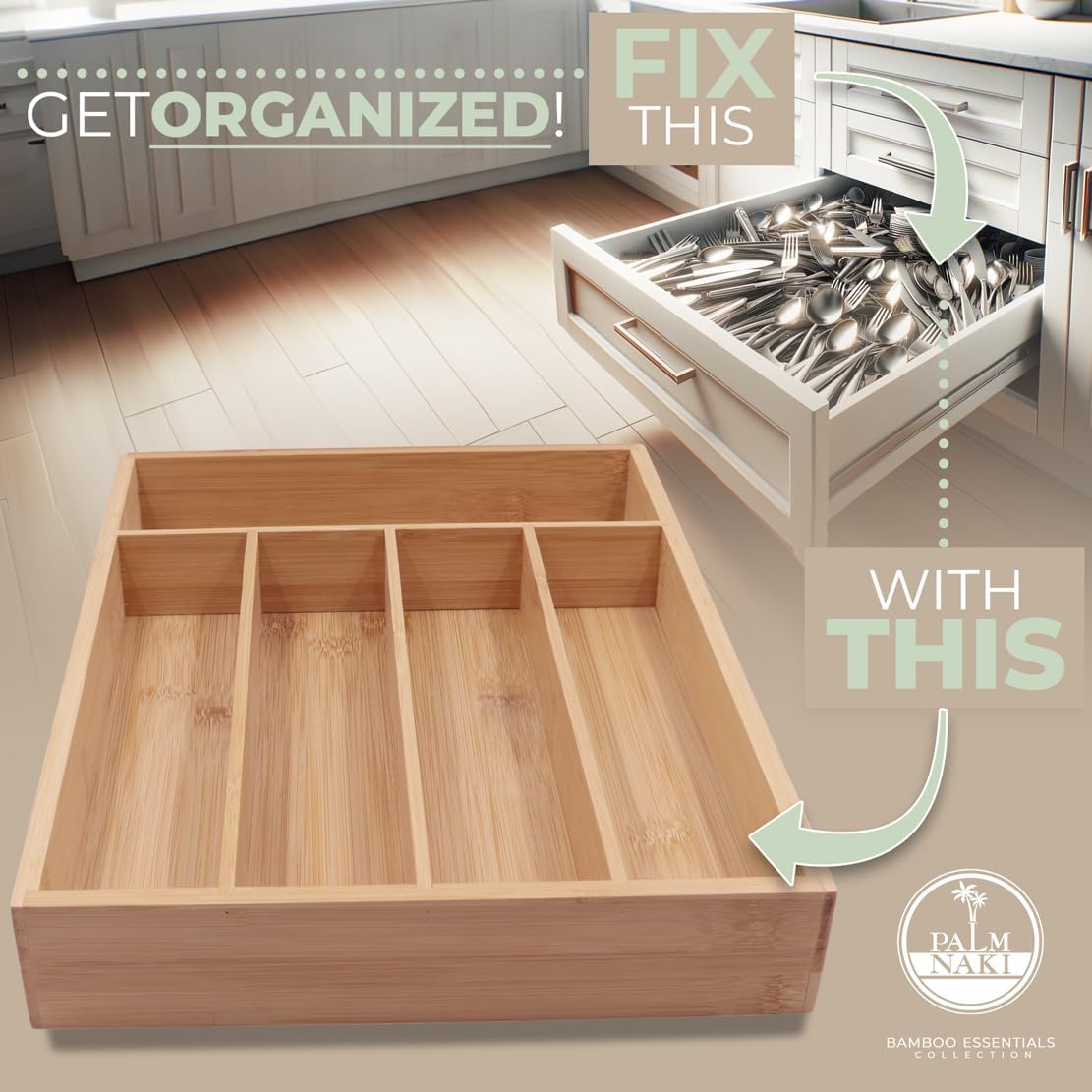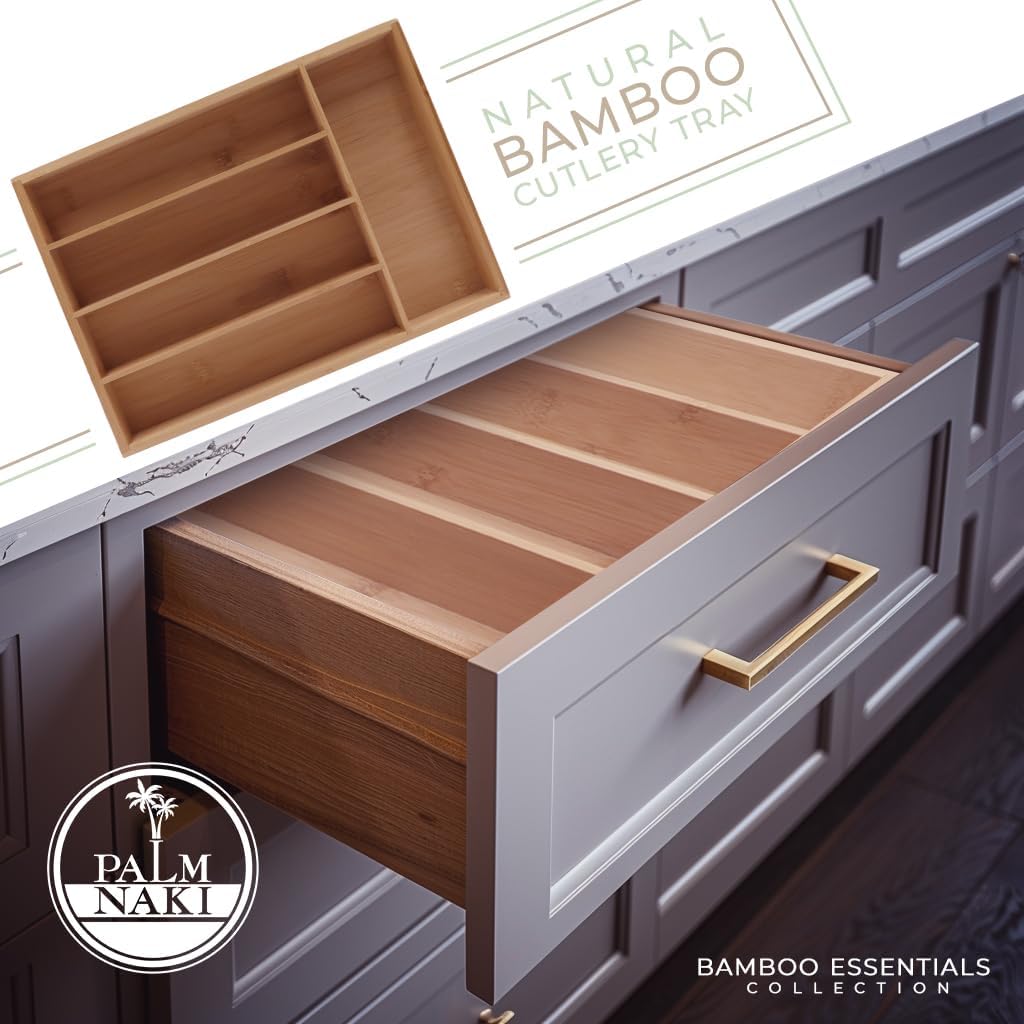 - šæ Transform Your Space with Elegance and Efficiency - Discover the ultimate solution to declutter your drawers and beautify your home with Palm Naki's premium bamboo cutlery tray. Designed with precision, our organizer features expansive compartments tailored to fit drawers of any size, ensuring a custom fit that brings harmony and accessibility to your kitchen, office, or vanity.
