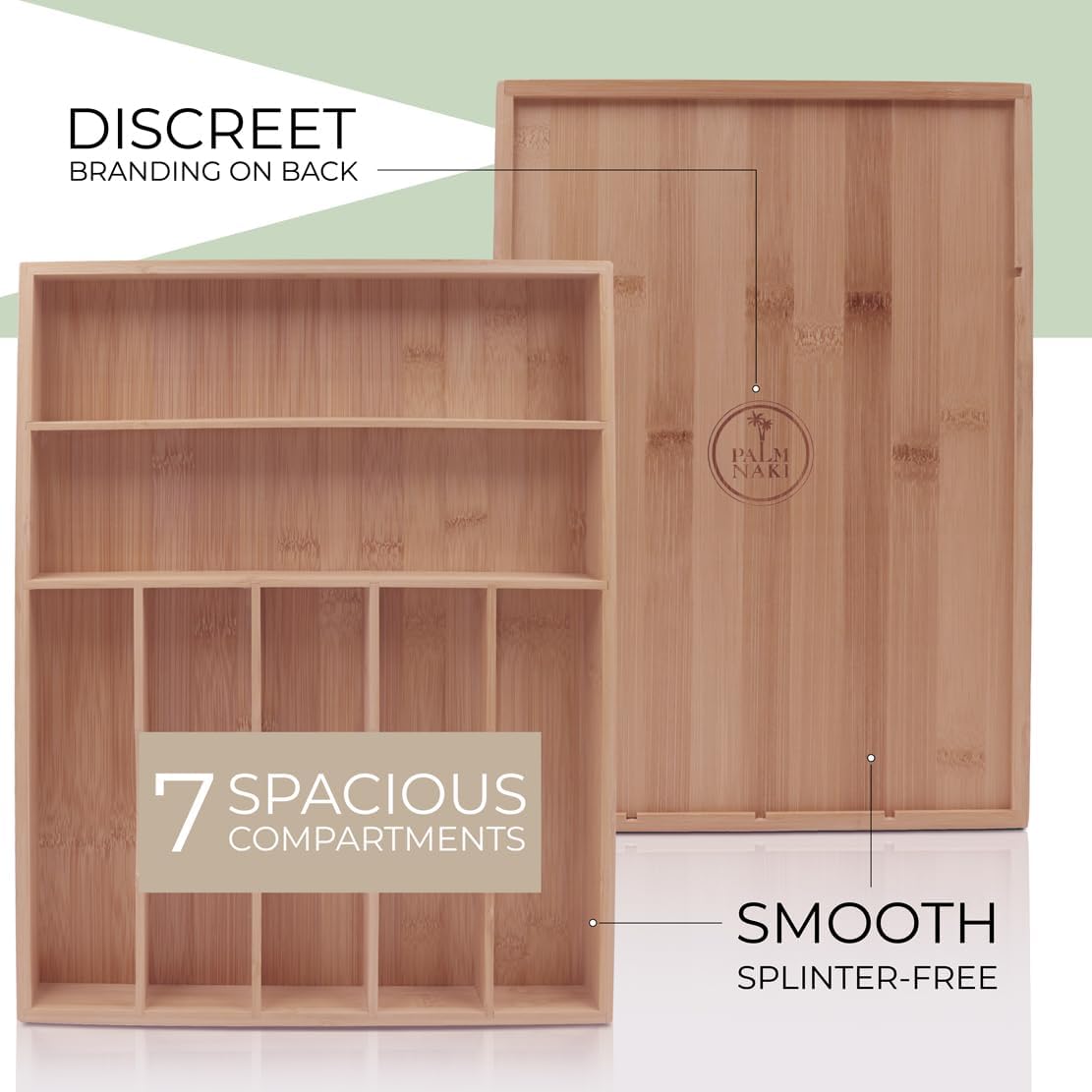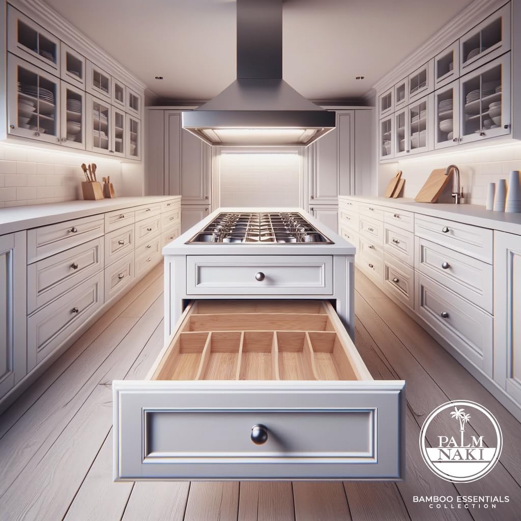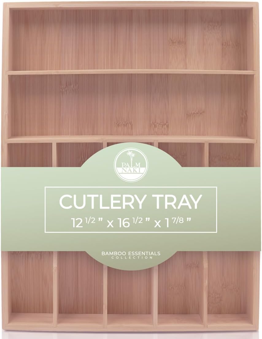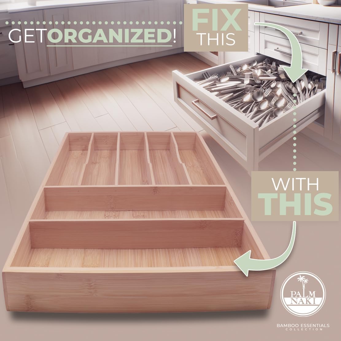 - šæ Transform Your Space with Elegance and Efficiency - Discover the ultimate solution to declutter your drawers and beautify your home with Palm Naki's premium bamboo cutlery tray. Designed with precision, our organizer features expansive compartments tailored to fit drawers of any size, ensuring a custom fit that brings harmony and accessibility to your kitchen, office, or vanity.