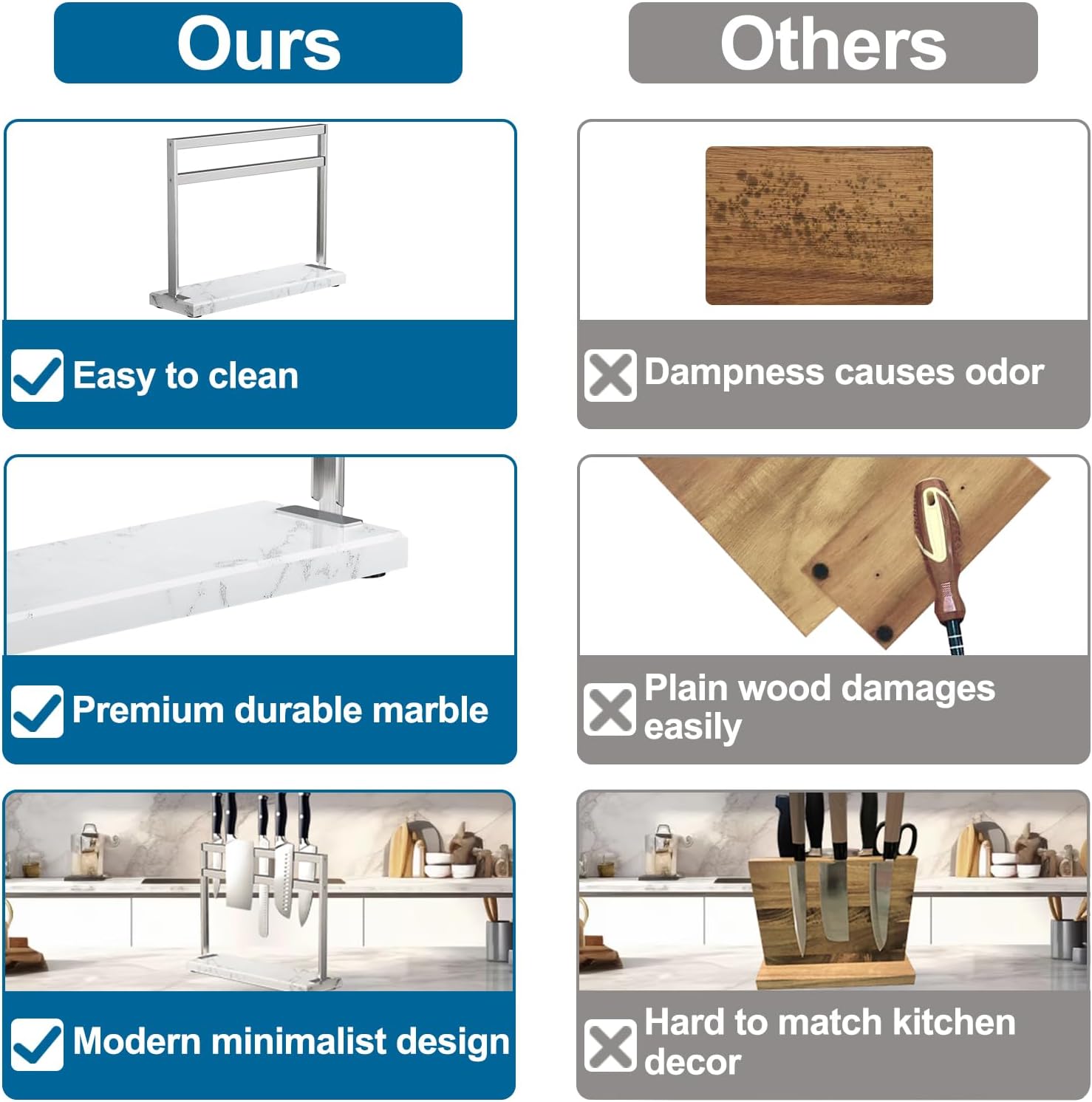 - 【Innovative Patented Design】Showcasing a fusion of high-grade 304 stainless steel and marble, this knife holder is not only aesthetically modern and elegant but also features a unique patented design. It brings a contemporary and stylish vibe to your kitchen, setting it apart from ordinary kitchen accessories