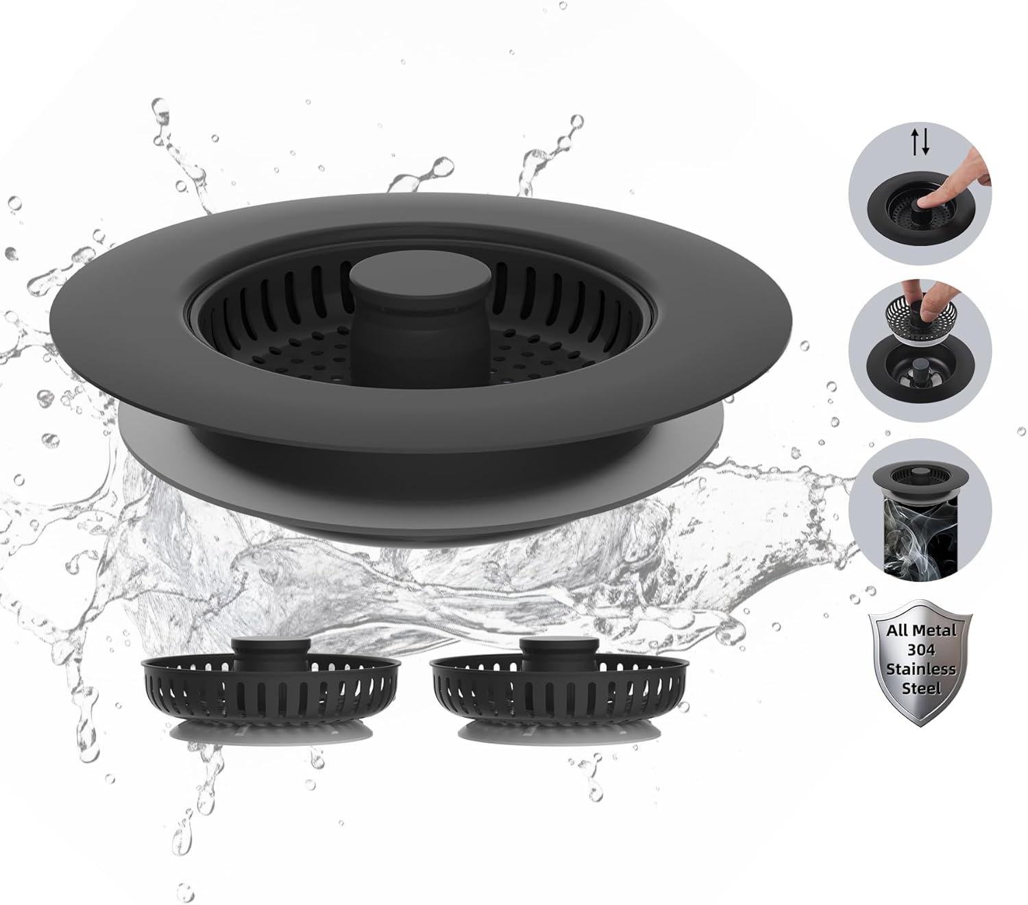Hibbent All Metal Stainless Steel 3 in 1 Kitchen Sink Drain Strainer, Upgraded Sink Stop Combo, 3 Anti-Clogging Stainless Steel Baskets Strainer with Metal Handle for US Standard 3-1/2" Drain, Black