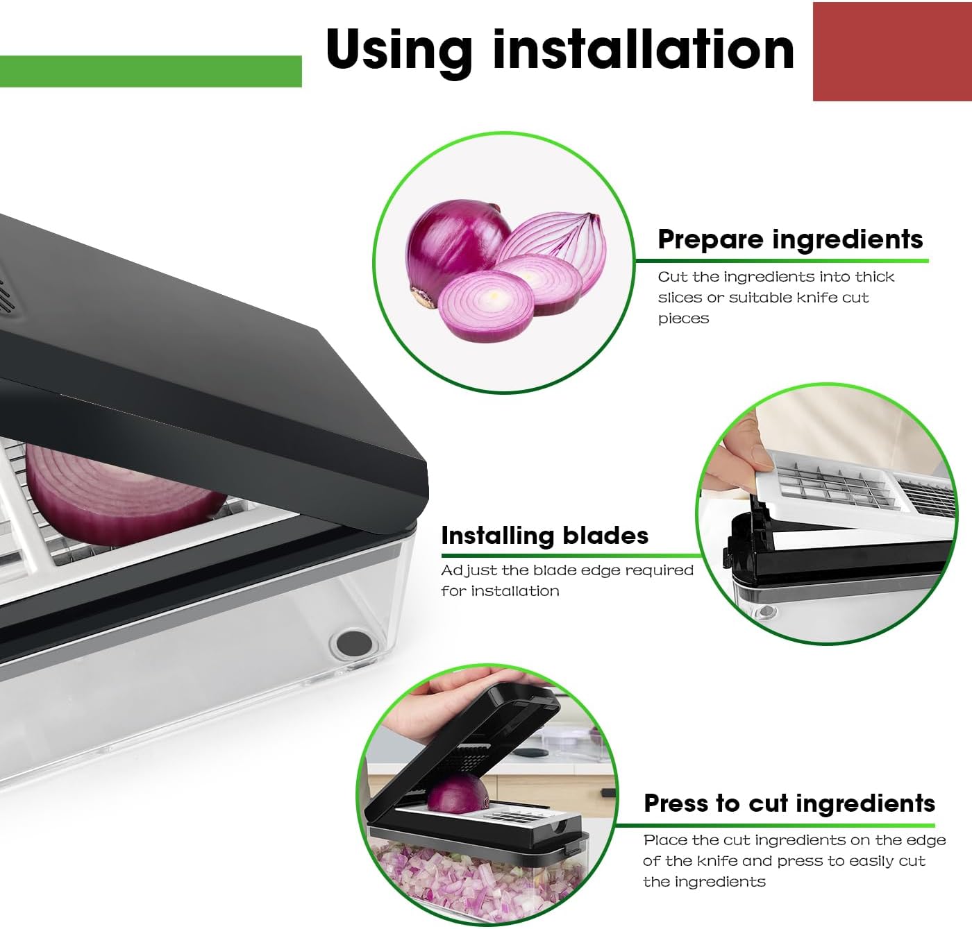 - Kitchen Essential: This vegetable chopper is a highly functional kitchen tool that features a variety of interchangeable blades, effectively reducing the time required for preparation and serving. It eliminates the need for manual chopping of vegetables and fruits, allowing for greater convenience and variety in meal preparation for families.