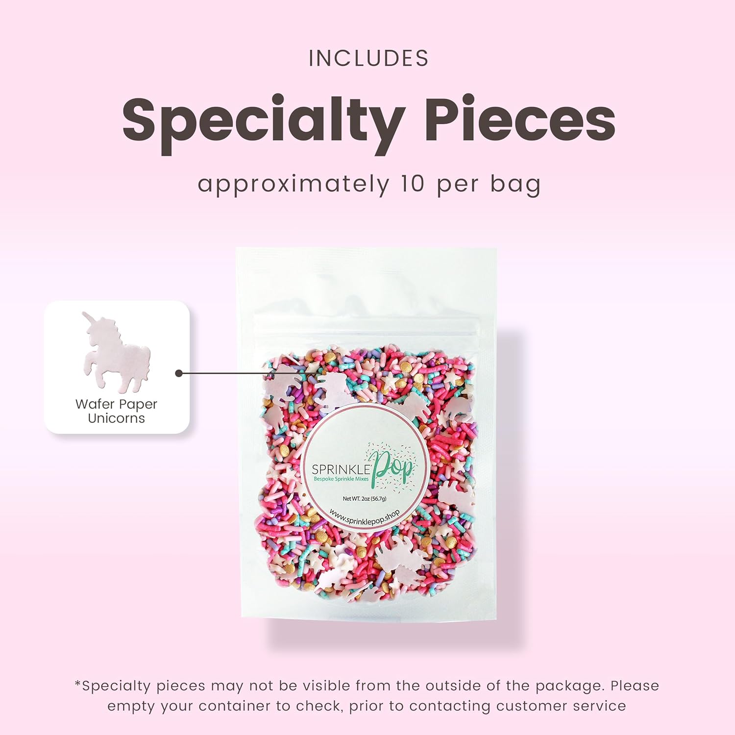 - A Vibrant rainbow sprinkle mix with pink jimmies and unicorn wafer papers, perfect for adding a magical touch to cakes, cupcakes, and cookies at birthday parties and celebrations
