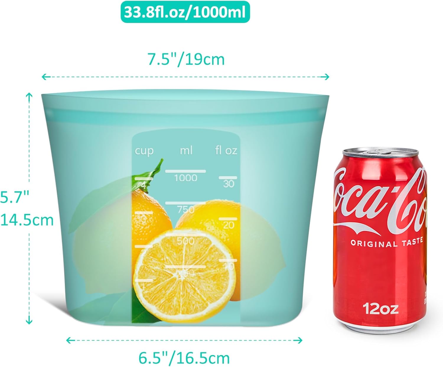 Reusable Freezer Bags Quart Size, 4 Pack, 100% Silicone Stand Up Ziplock Reusable Silicone Food Storage Bags Sandwich Bags Containers, Freezer Microwave Oven Dishwasher Safe, Aqua, 33.8fl.oz