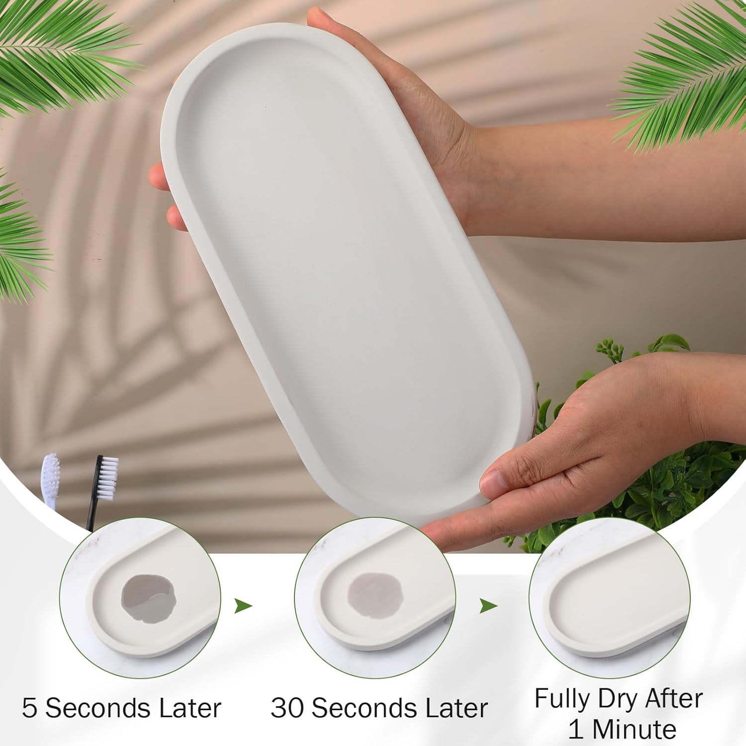 - Compact Yet Spacious: This oval stone tray measures 1 inch high, 4.9 inches wide, and 11 inches across. It is very roomy to rest 2 glass bottles, 1 dish sponge plus 1 dish brush, everything you need is close at reach.