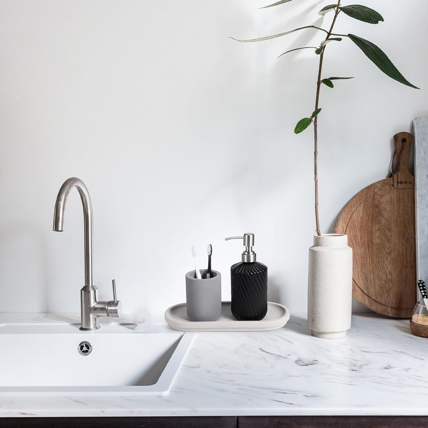- Add A Touch of Minimalist Chic to Your Home with BOJDOPIE sink caddy. This tray will showcase the unique beauty of stone, and its subtle tones seamlessly harmonize with any color palette. It can be a kitchen sink day, bathroom vanity tray or mini plant holder.