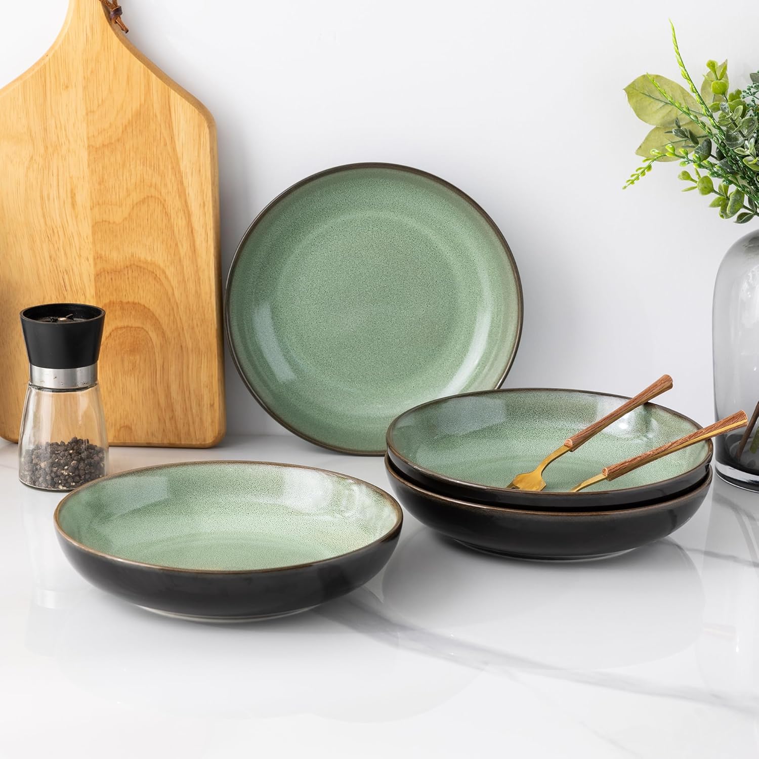 - 【ELEGANT AND Four COLOLS DESIGN】 This collection leads the dining trend with its expressive colors and finishes. The striking reactive glaze and rich, vivid tones not only soothe the senses but also enhance your dining experience. They are very big, so you have plenty of room for all the food you want to put on it. Their bottoms are flat to allow food to be easily cut in the bottom of the bowl with the dinner knife,this is great for making sure that nothing is spilled off the edge.