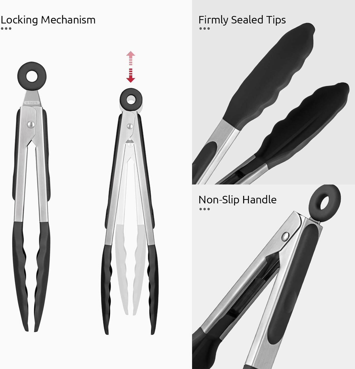 - [18/8 Stainless Steel Handles & BPA Free Silicone] U-Taste kitchen cooking tong set is made of 18/8 stainless steel and food grade silicone. Upgraded 0.8mm thick stainless steel is sturdier and tougher compared to the original version (0.6mm thick). Capable to serve a large piece of food with no sign of shaking or bending. No more strong smell, risk of rusting, deformation or any other problems like chipping off. Handles coated with BPA free silicone provide a comfortable and non-slip grip.