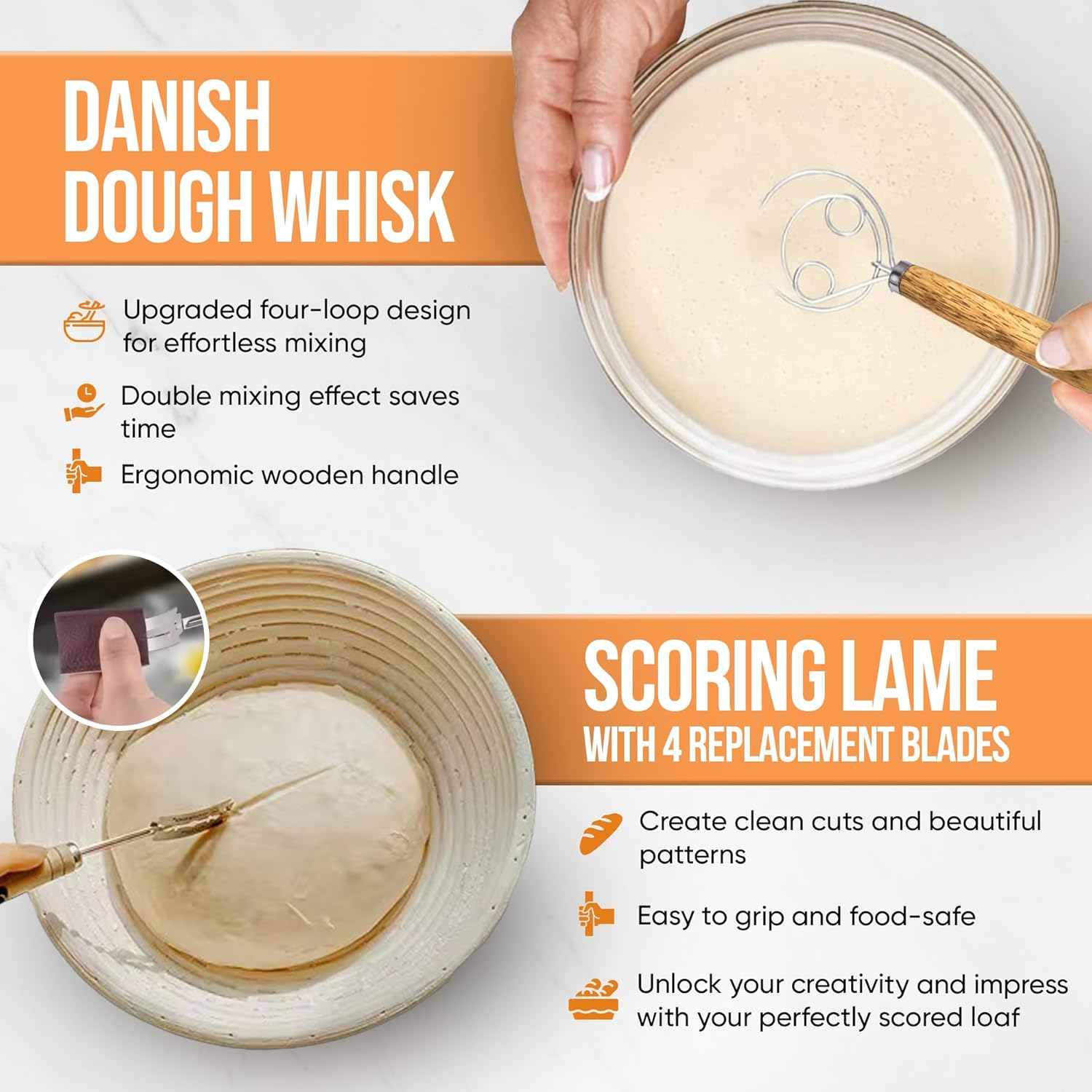 - CRUSTS THAT DAZZLE, FLAVORS THAT WOW – Made from premium natural rattan, our bread proofing basket helps your dough achieve that professional-grade crust. Pair it with our included sourdough baking supplies to make loaves that look and taste incredible. Our Sourdough essentials kit Includes Round 9-inch and Oval 10-inch Proofing Baskets, Dough Whisk, Bread Lame with Blades, Brush, Flour Duster, Plastic Bowl Scraper, Metal Dough Scraper, Bannton Liner, and Recipe Book.