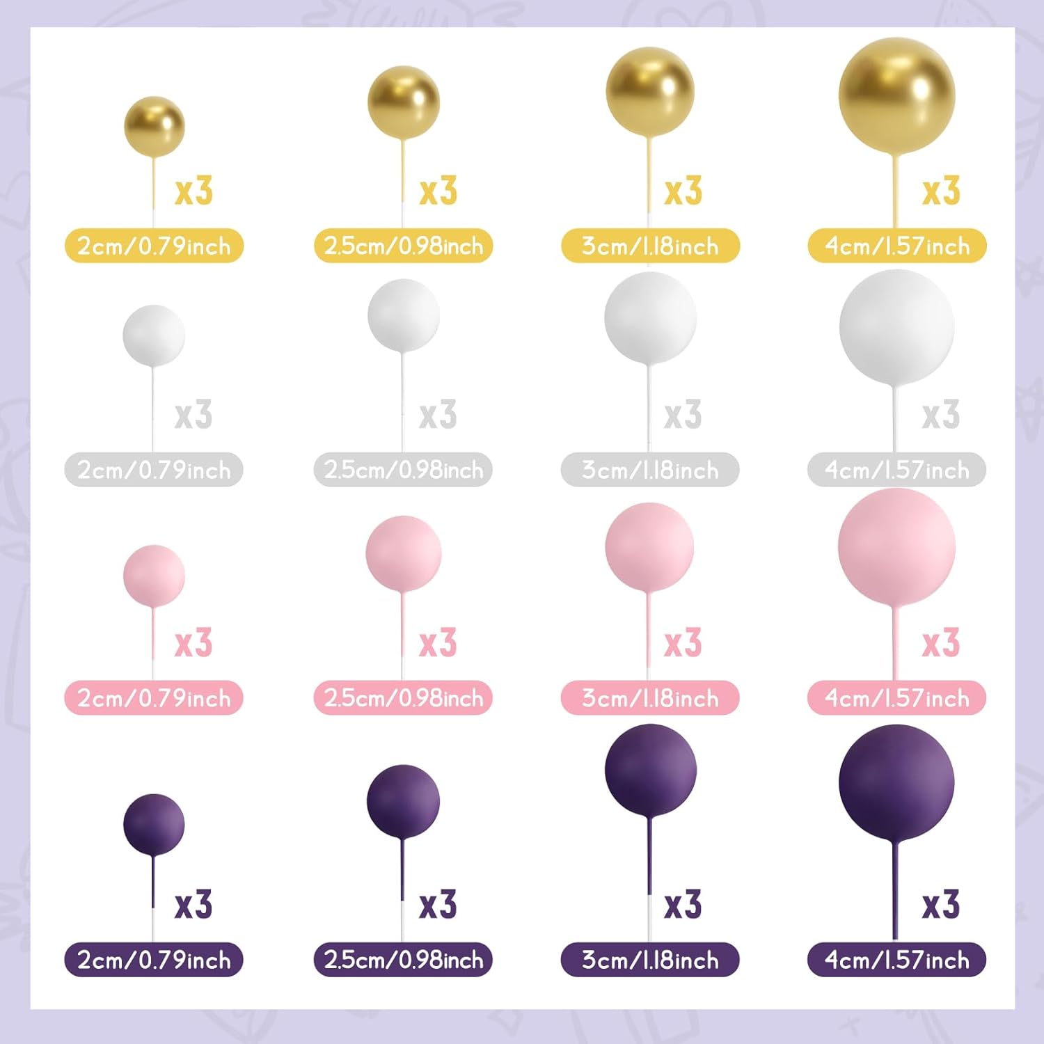 48 Pcs Balls Cake Topper Decorations Balloon Cupcake Toppers Foam Cake Topper Balls Cake Balls Decorations for Birthday Party Wedding Anniversary Cake Decorating (Pink, Purple, White, Gold)
