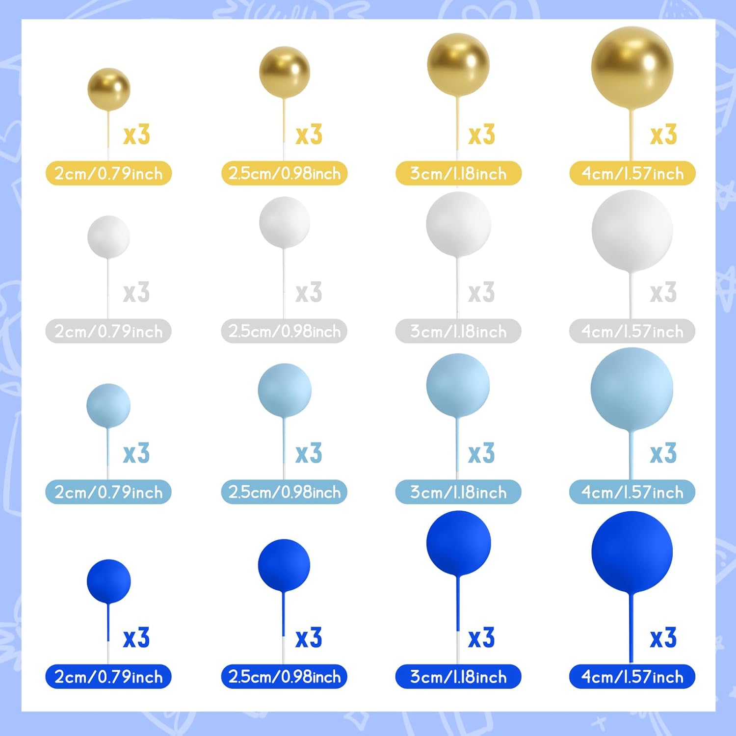 - Package Includes: You will get 48 pcs cake balls decorations in 4 colors and 10 butterflies cake decoration, including royal blue, light blue, white and gold. 12 pieces of each color. The quantity of each sizes and colors included in each set are as shown in the picture