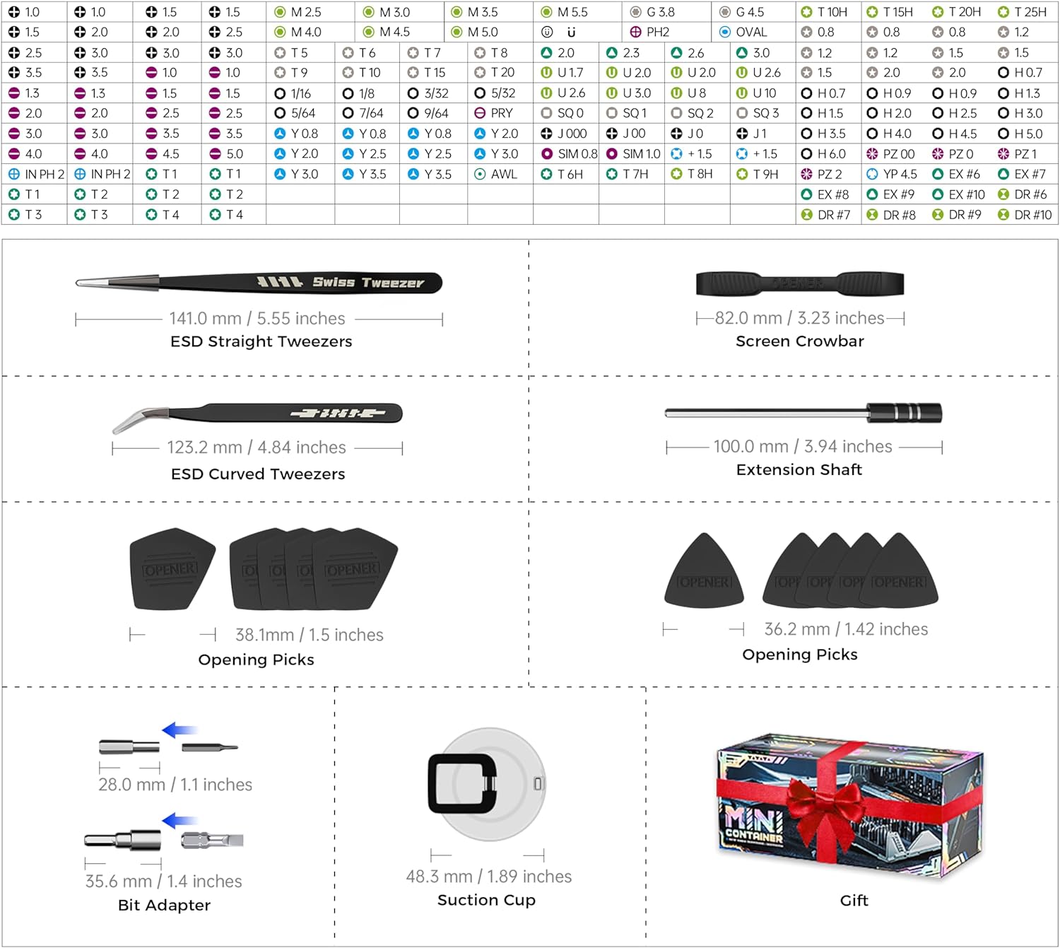 - 【 Compact Screwdriver Set 】This small screwdriver repair tool kit shaped like a container, allowing multiple sets to be stacked. 160 common magnetic bits are built into the 4 partitions for easy access and won't fall out. Each bit is marked with standard or inch markings for quick identification of the screwdriver tip you need. Also included are straight and curved ESD tweezers, opening picks, crowbars, extension shaft, bit adaptors, suction cup for easy screen removal and easy carrying.
