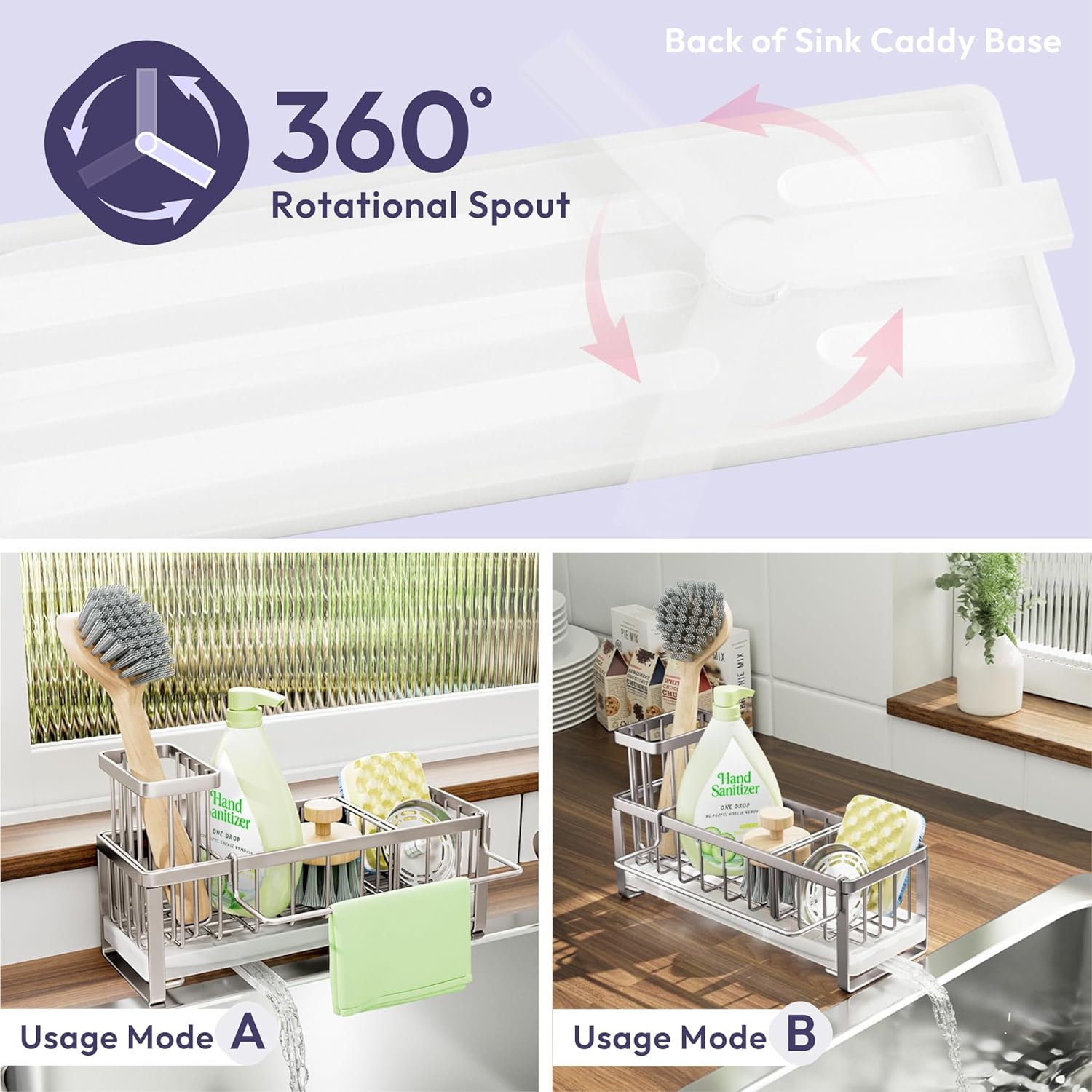 - [Automatic Draining]: Are you tired of cleaning the countertop?SWTYMIKI sponge holder for kitchen sink with 360Β° rotatable draining pipe can help you! Just put the sink caddy next to the sink, the water will drain automatically into the sink