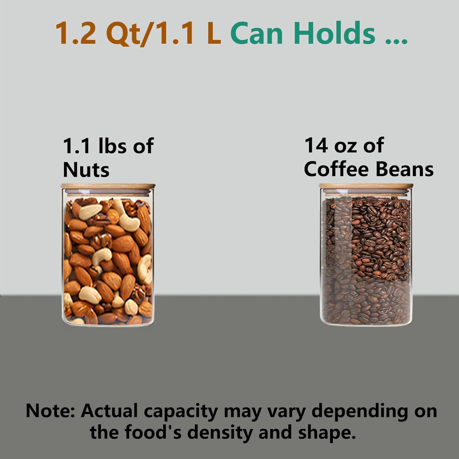1.2 Qt Square Glass Storage Containers with Lids, glass jar with airtight lid, Glass Canister for Pantry Cookie Flour Cereal Rice Sugar Tea Coffee Beans Spice, Square Set of 4