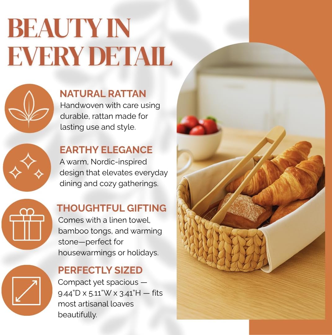 - INNOVATIVE BREAD STONE: Featuring a bread stone, our bread basket with warming stone keeps your bread at the perfect temperature. This elegant bread serving basket is an excellent housewarming gift basket, combining functionality with style for any occasion.