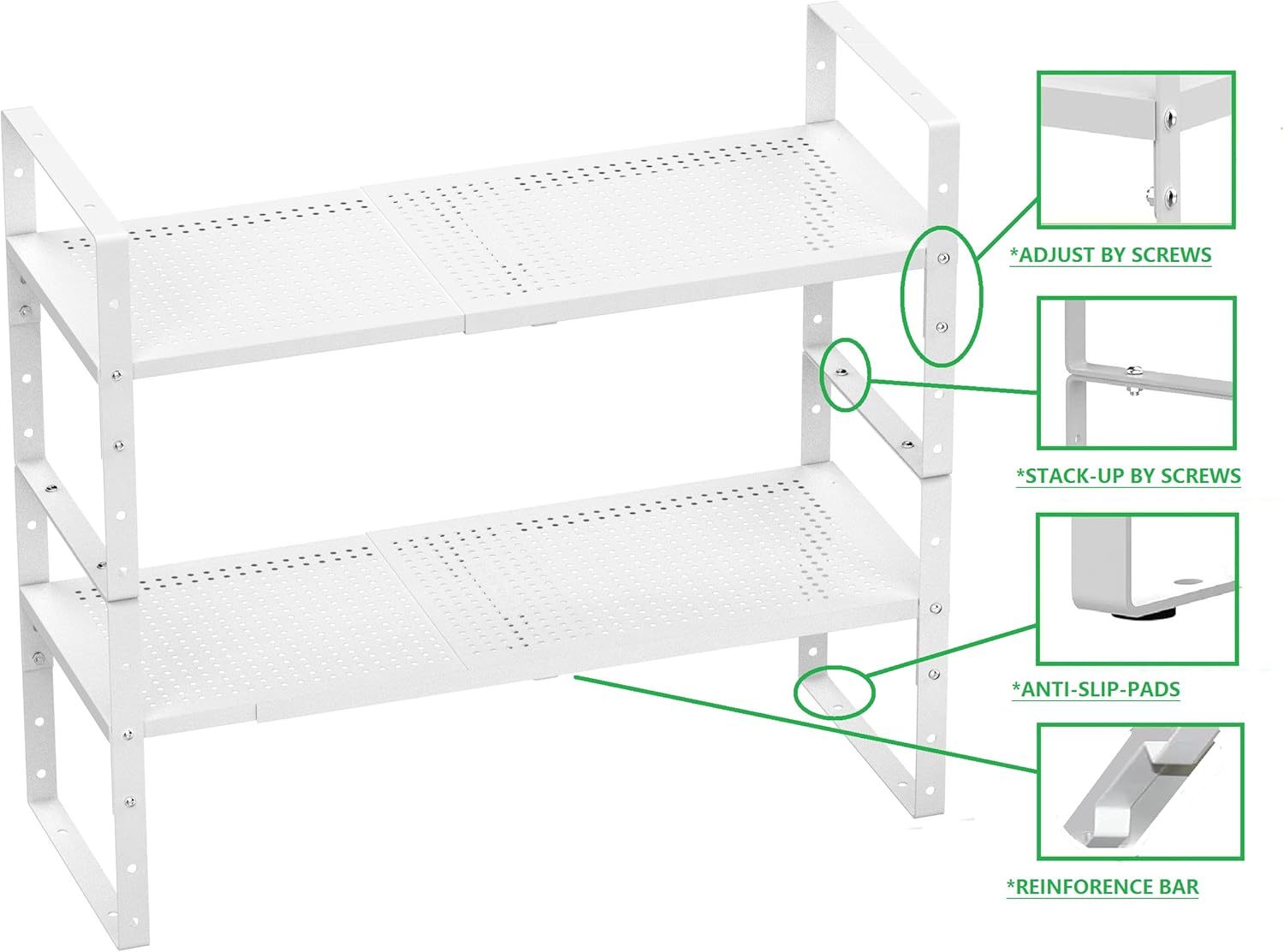 - ⭐【Expandable & Stackable Cabinet Organizer】This cabinet shelf is expandable, allowing you to adjust the width and height to suit your needs.The measures are 10.24"Dx16.54~27.17"Wx2.17~7.88"H.There are 5holes for each side which can be adjusted the width from 16.54" to 27.17".It also can be easily stacked up to a 2 or 3 tier kitchen organizer.