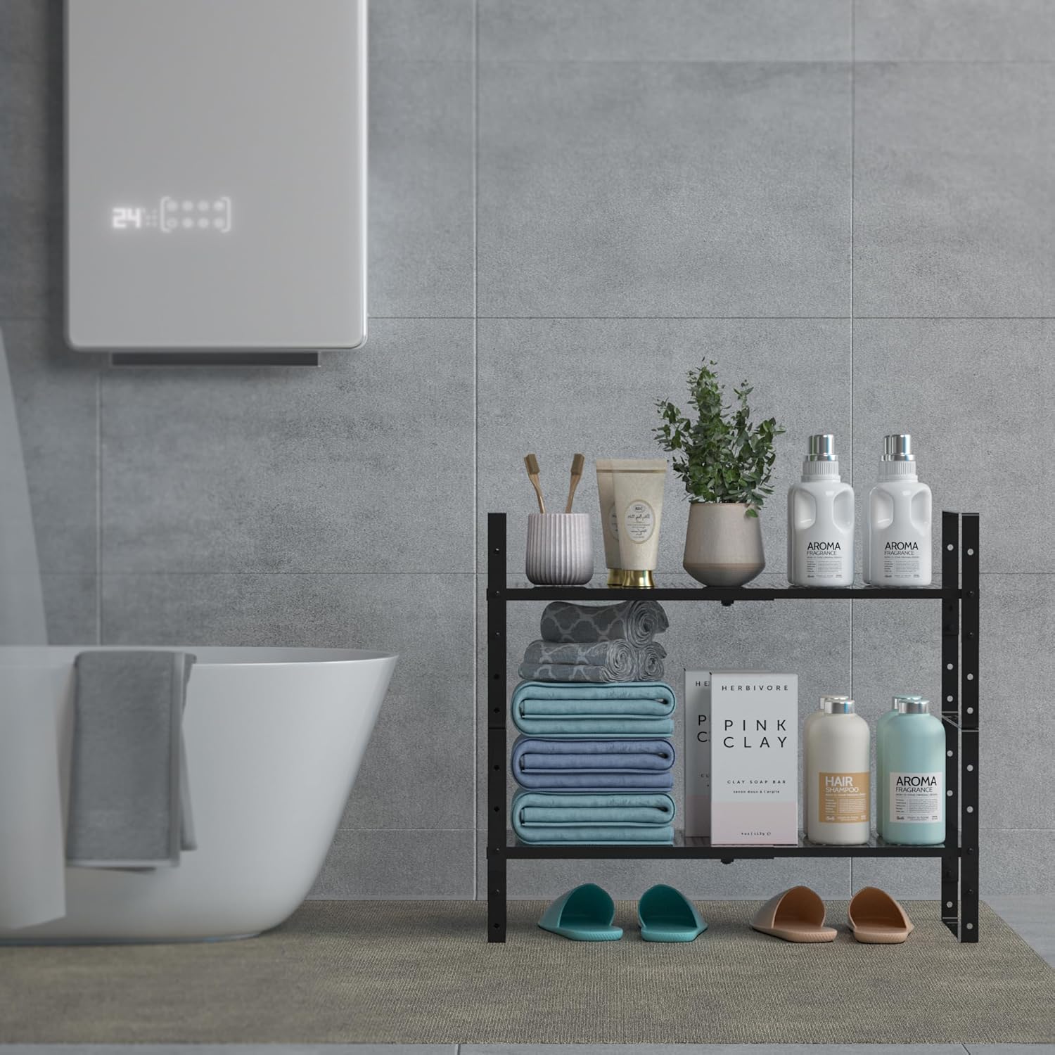 Expandable Shoe Rack Stackable Metal Pantry Storage Shelves Stand Adjustable Height Cabinet Shelf Organizer Racks Spice Shelving(2PACKS/BLACK,MEDIUM)