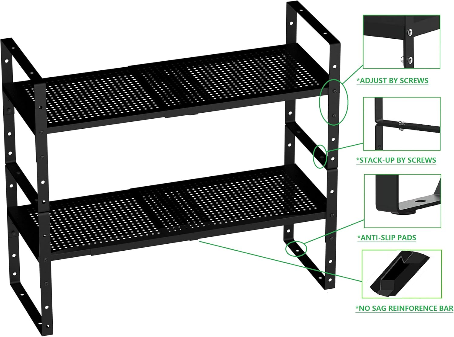 Expandable Shoe Rack Stackable Metal Pantry Storage Shelves Stand Adjustable Height Cabinet Shelf Organizer Racks Spice Shelving(2PACKS/BLACK,LARGE)