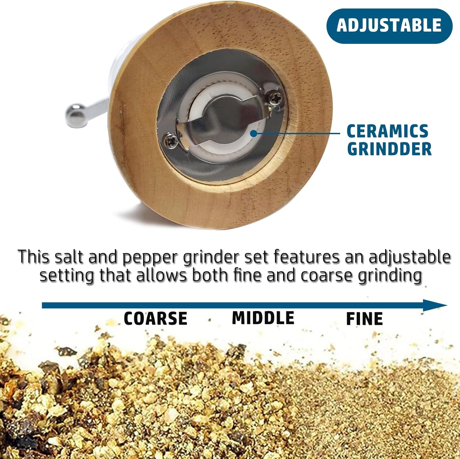 - 4、NATURAL WOOD MATERIAL - This manual salt and pepper grinder set is made of natural oak wood, stainless steel and ceramic grinding mechanism,Environmental protection Acrylic materia,non-corrosive, you can use safely.This natural wooden salt and pepper mill is a elegant and fancy decoration in kitchen.