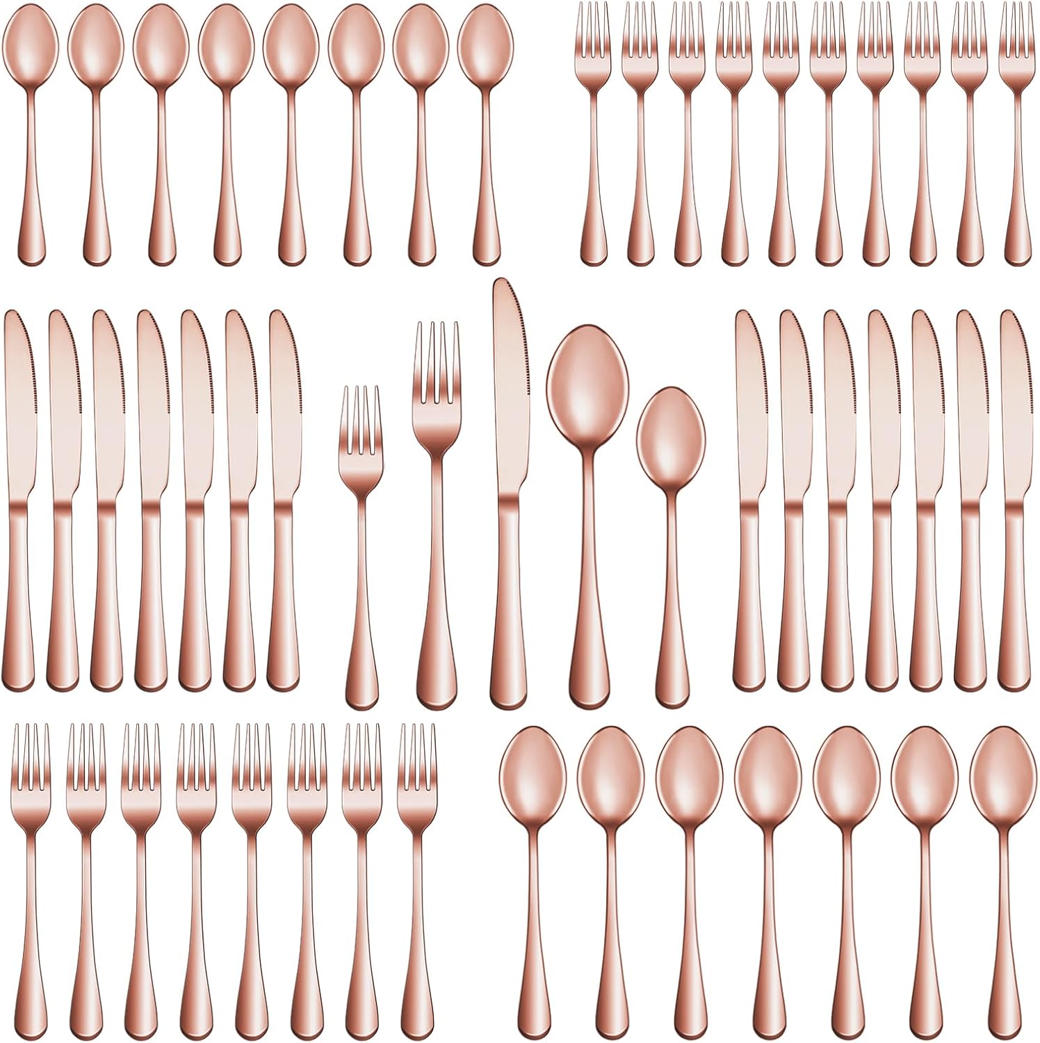 - 30 PCS ROSE GOLD SILVERWARE SET SERVICE FOR 6: This rose gold silverware set comes with 6 Dinner Forks, 6 Dinner Spoons, 6 Dinner Knife, 6 Salad/Dessert Fork and 6 Dessert/Tea Spoons, essential for families or restaurants. The set is also an irreplaceable dining tool whether it is for daily use or for preparing dinners or parties.