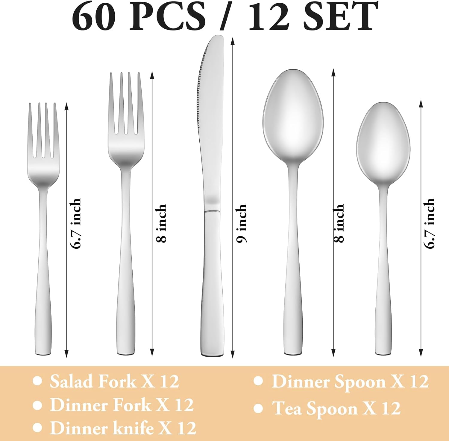- 60 PCS SILVERWARE SET SERVICE FOR 12: This silverware set comes with 12 Dinner Forks, 12 Dinner Spoons, 12 Dinner Knife, 12 Salad/Dessert Fork and 12 Dessert/Tea Spoons, essential for families or restaurants. The set is also an irreplaceable dining tool whether it is for daily use or for preparing dinners or parties.