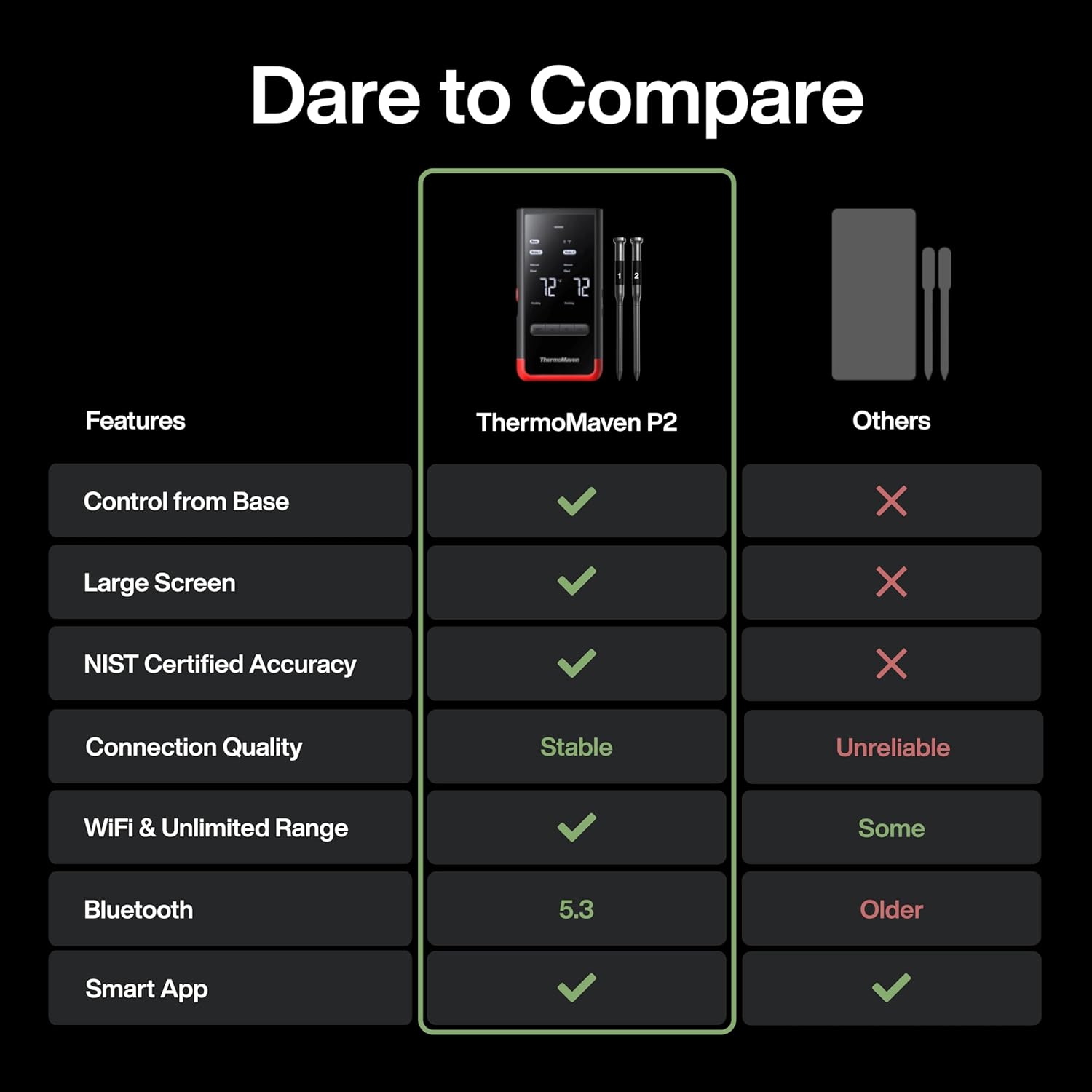 - Unlimited Range via Wi-Fi: Many wireless thermometers are restricted to Bluetooth to connect your phone with the base, but the ThermoMaven P2 features advanced 2.4GHz Wi-Fi connectivity. This lets you monitor your culinary creations from anywhere.