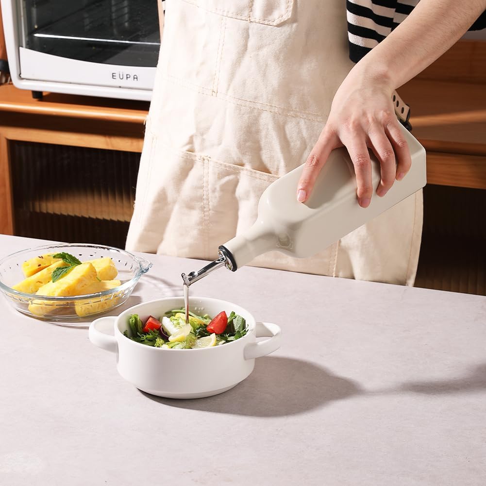 - Leak Proof & Keep Liquid Fresh - The bottle is made of durable ceramic that creates a smooth glaze. Designed with a spout makes it easy to open and close the vinegar bottle for extended shelf life of liquid. And the opaque porcelain bottle protects the oil from light and makes it last longer.