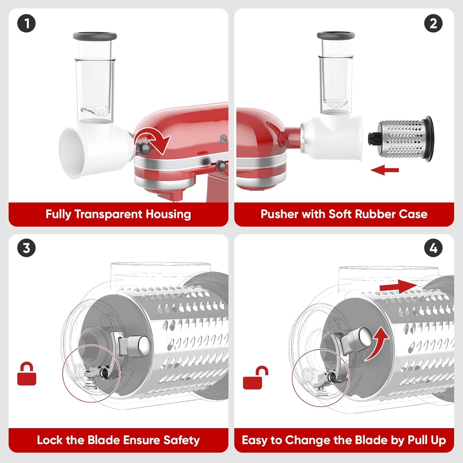 - Simple Operation and Use: This attachments for kitchen aid cheese grater attachment for kitchenaid stand mixer is simple attach and operate it to the kitchen aide mixer, no need to move the housing out of mixer when exchange blade drums, one step to take out without touching the knife holes (Humanized Protection).