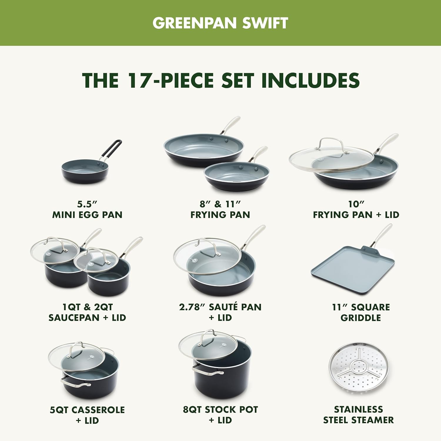 - 17 PIECE SET: Includes 5.5” Mini Egg Pan, 8” and 11” Frying Pans, 10” Frying Pan with Lid, 1QT and 2QT Saucepans with Lids, 2.8QT Sauté Pan with Lid, 11” Square Griddle, 5.15QT and 8QT Stockpots with Lids, Stainless Steel Steamer