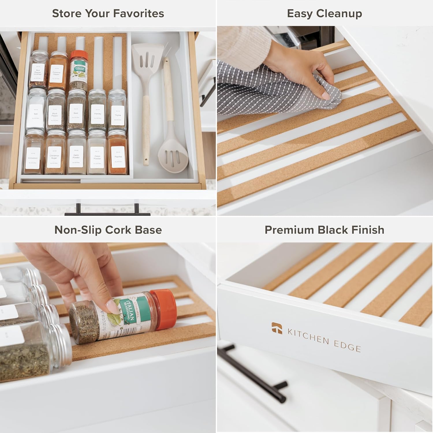 - STREAMLINED DRAWER STORAGE: Efficiently organize your kitchen with a versatile spice or vitamin drawer organizer. Its non-slip cork base ensures stability, preventing items from shifting. With expandable compartments catering to utensils or larger spice containers, this organizer adapts to your needs, maximizing both space and functionality in your kitchen drawers.