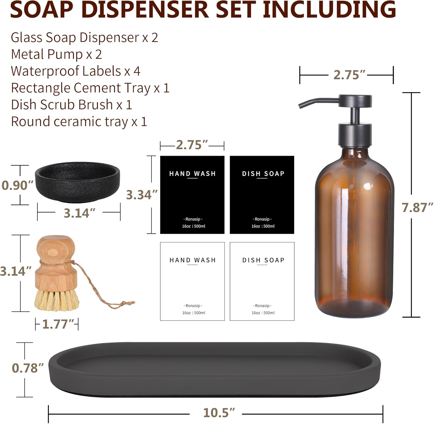 Set of 5 Kitchen Soap Dispenser Set 16 Oz Glass Hand Dish Soap Dispenser with Stainless Steel Pump, Cement Tray, Dish Scrub Brush for Farmhouse Rustic Home Bathroom Decor (Brown)
