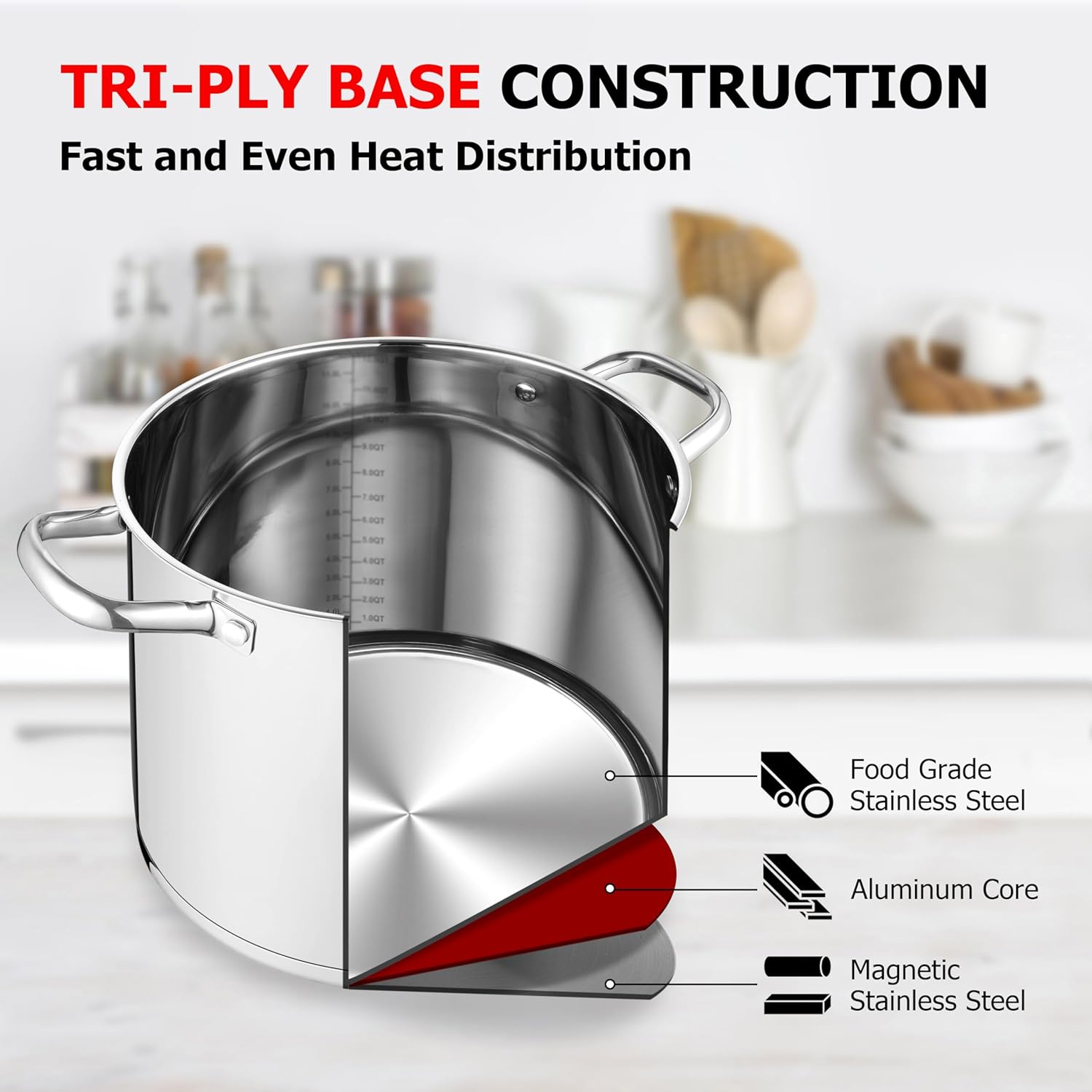 - Tri-ply Based Construction, the bottom of cooking pot consists of 3 layers. The inner layer is food grade stainless steel, itβs safe to contain food; the outer layer is magnetic stainless steel that decides this stockpot can be compatible with induction cooker, gas, electric, halogen, ceramic and oven. Between them, the impact-bonding aluminum core facilitates the soup pot a fast and even heat distribution and good heat conduction