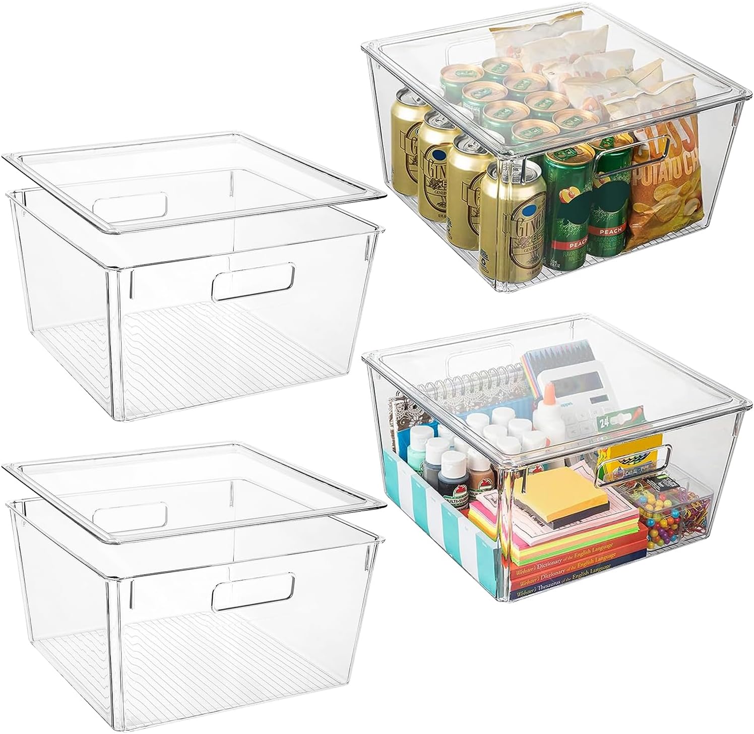 - YOU WON'T FIND A MORE VERSATILE SET OF BINS: You can use these large clear plastic storage containers with lids for organizing any space in and around your home โ the kitchen, cabinets, refrigerator, closets, pantries, bedroom, dining room, laundry room, nursery, garage, kids toy room, under sink organizers and more.