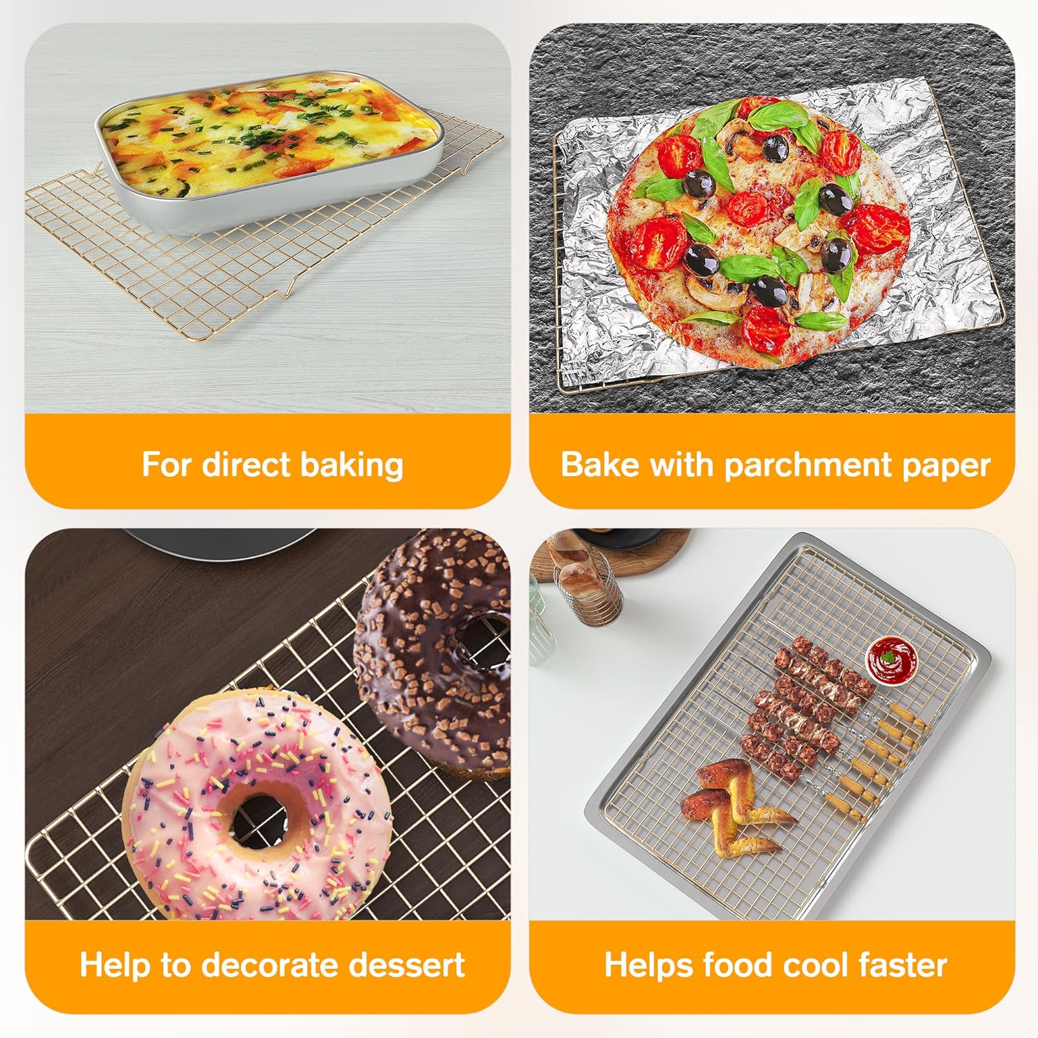 - 【UNIQUE PRODUCT DESIAGN】: The one-piece 4 raised feet of baking rack are specially designed to allow for optimal air circulation, making food crispier after cooling. More suitable grid spacing prevents food placed on it from falling or deforming.