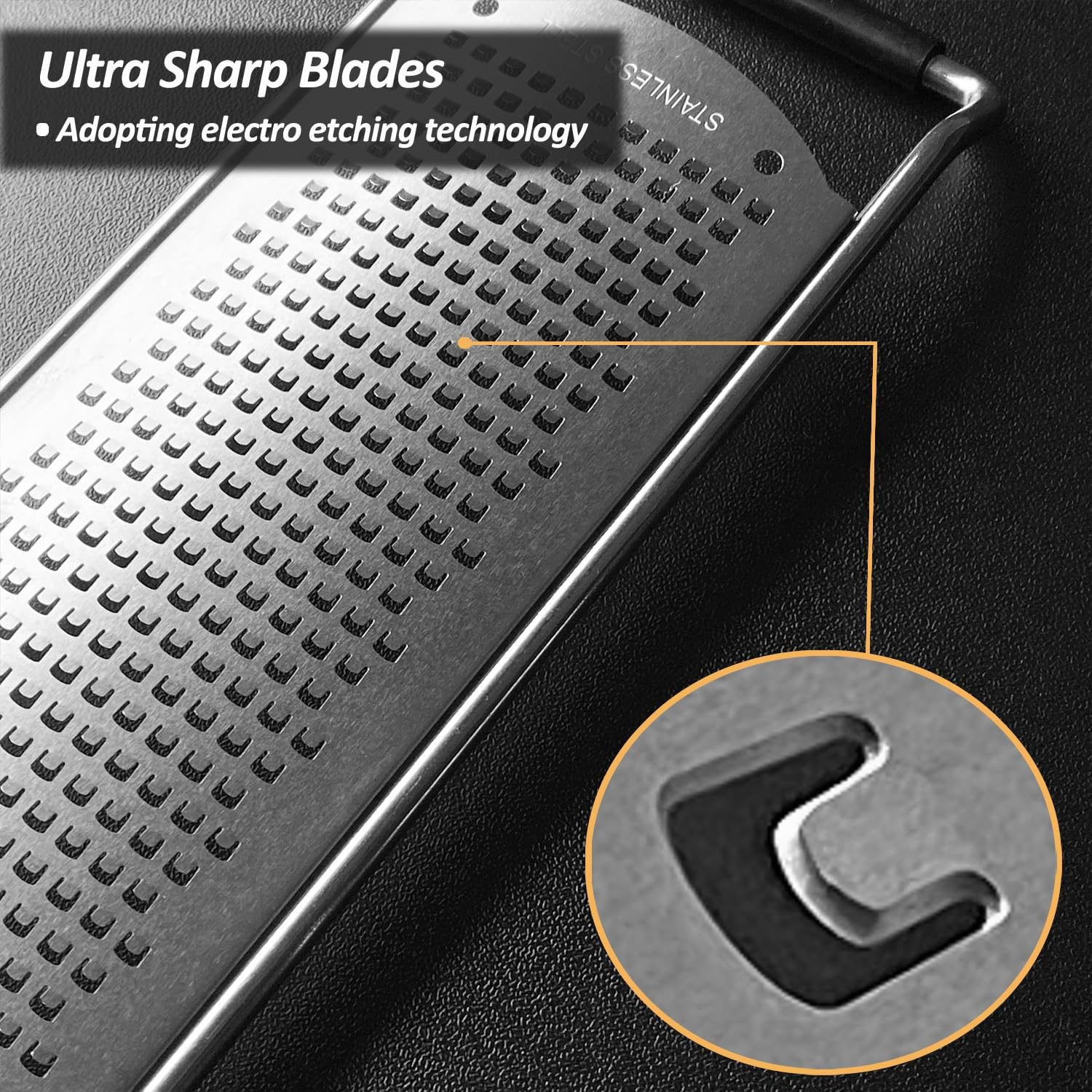 - EFFORTLESS & SAFE - The blade of this cheese grater is designed with special square blade and processed with photo-etching technology. Tough body with large size non-slip handle makes it more safe and effortless while grating. It is the better choice of grater and zester for kitchen tools