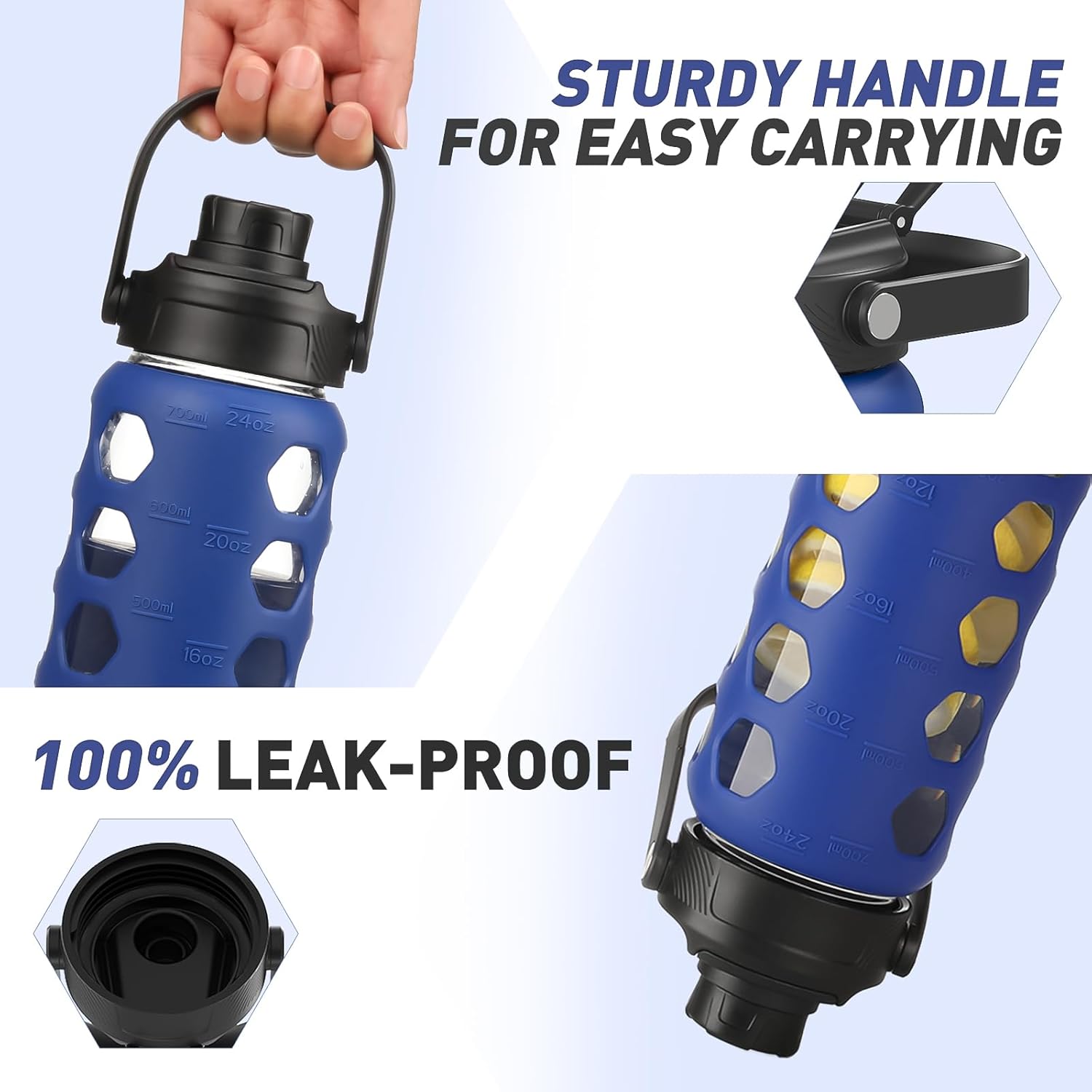 MUKOKO Glass Water Bottles, 24oz Glass Tumbler with Straw, Drinking Bottles with 2 Lids-Handle Spout Lid&Bamboo Straw Lid, Motivational Water Bottle with Time Marker and Silicone Sleeve, 1 Pack-Blue