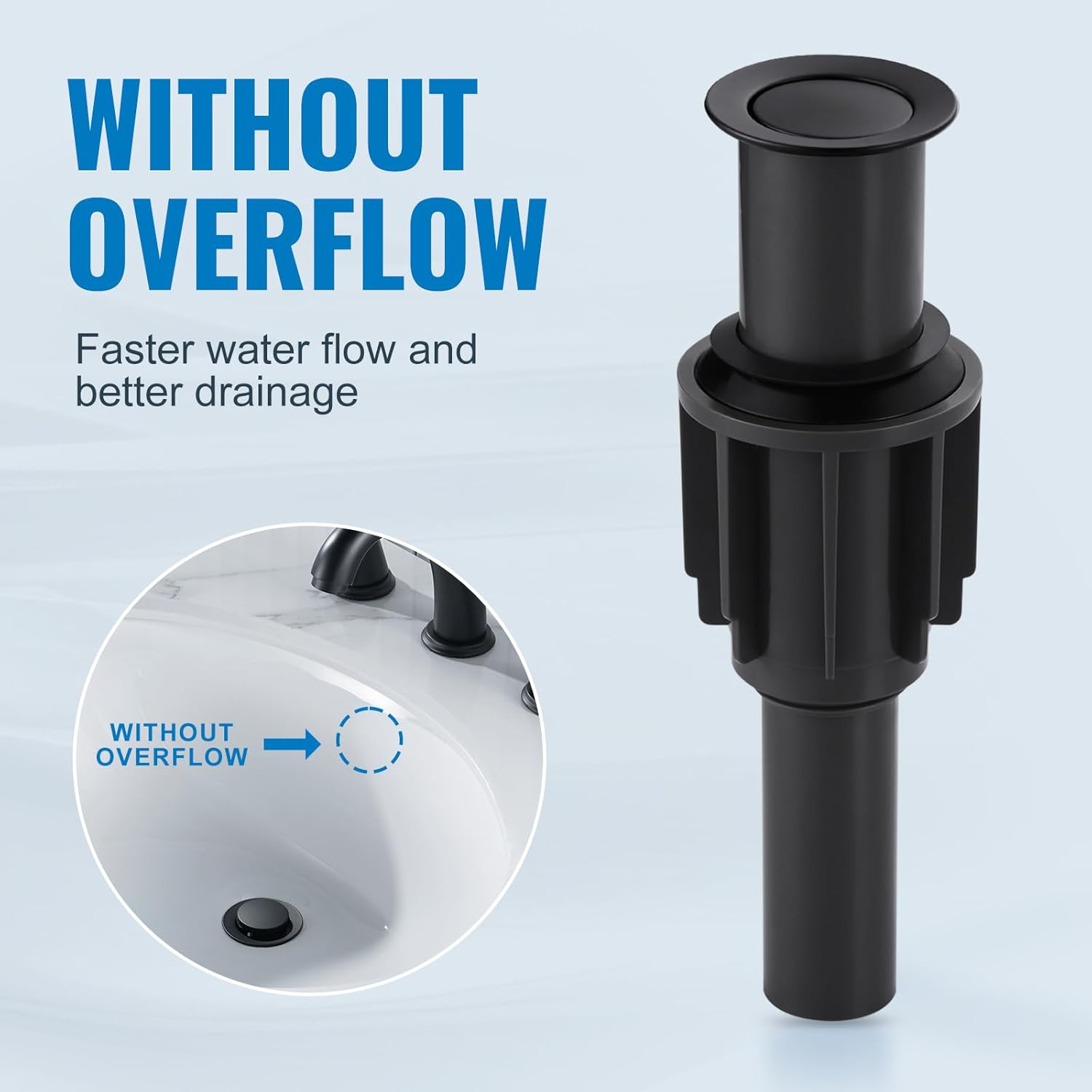 - 【Without Overflow】- This pop up drain stopper assembly works with vessel, basin, and above Counter bathroom sinks without Overflow and allows for faster drainage.