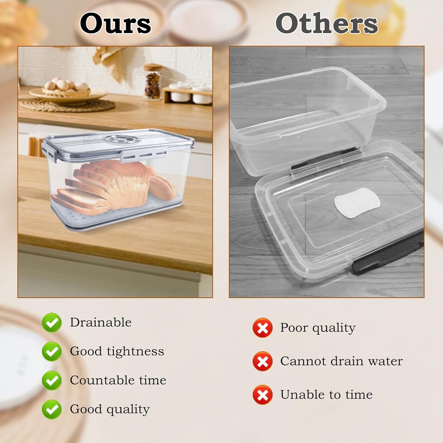 - ๐ ใDetachable Drain Boardใ: The bread storage container can not only hold bread, but also fruits, vegetables, etc. There is a detachable drainage plate inside the food container, and a porous drainage pad holds the food up, preventing the bottom of the bread box from tightly sticking to the food and preventing it from rotting and spoiling when storing vegetables and fruits in water.