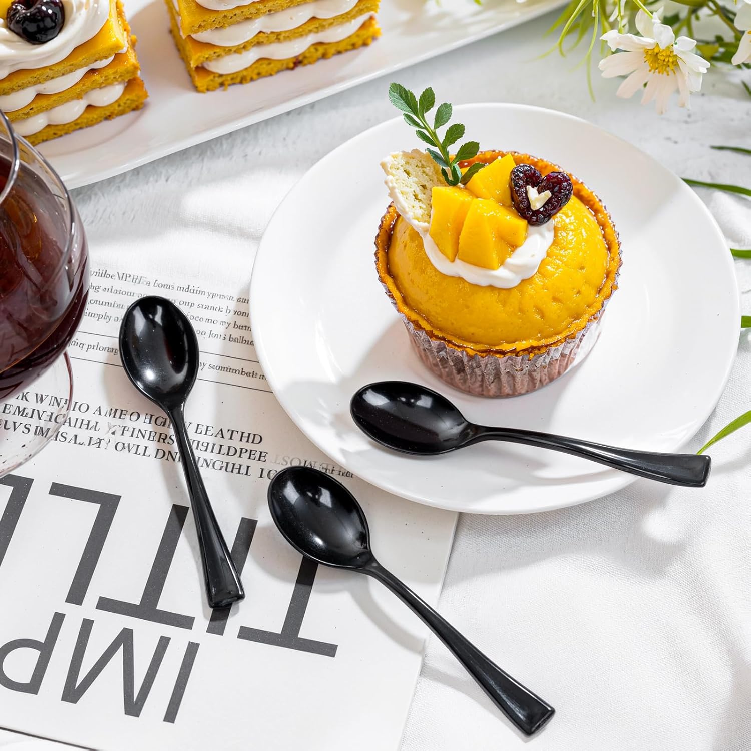 - PACKAGING AND QUALITY: Each package contains 300 black plastic spoons for desserts, 4 inch size fits most desserts. All materials we use are heavy duty plastic to protect your use. These disposable mini spoons have a smooth and durable surface that won't scratch or crack easily, ensuring a pleasant dining experience for you and your guests.