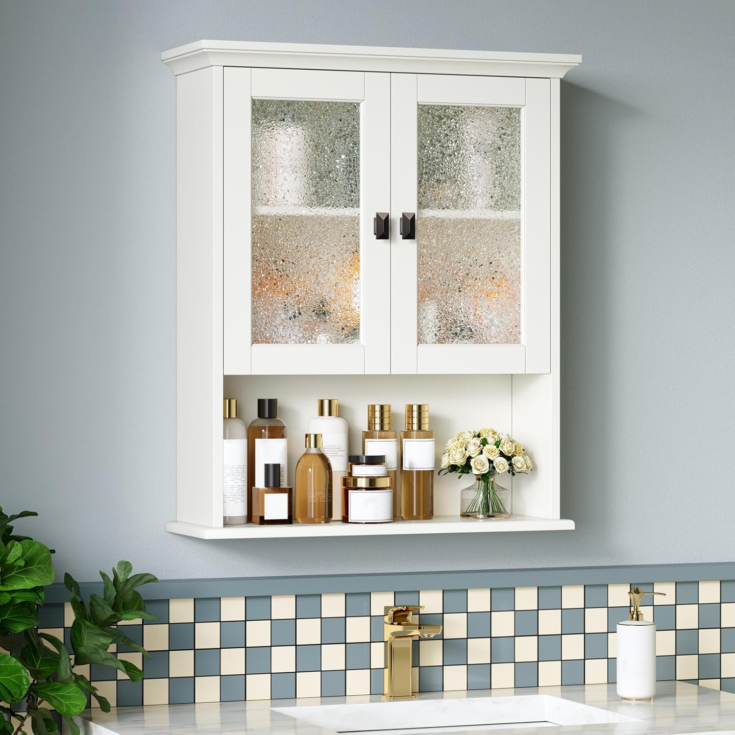Bathroom Cabinet Wall Mount, Over Toilet Storage Cabinet with Glass Door Build-in Spirit Level Cupboard Hanging Medicine Cabinet for Bathroom Laundry Kitchen Living Room (Cream White)