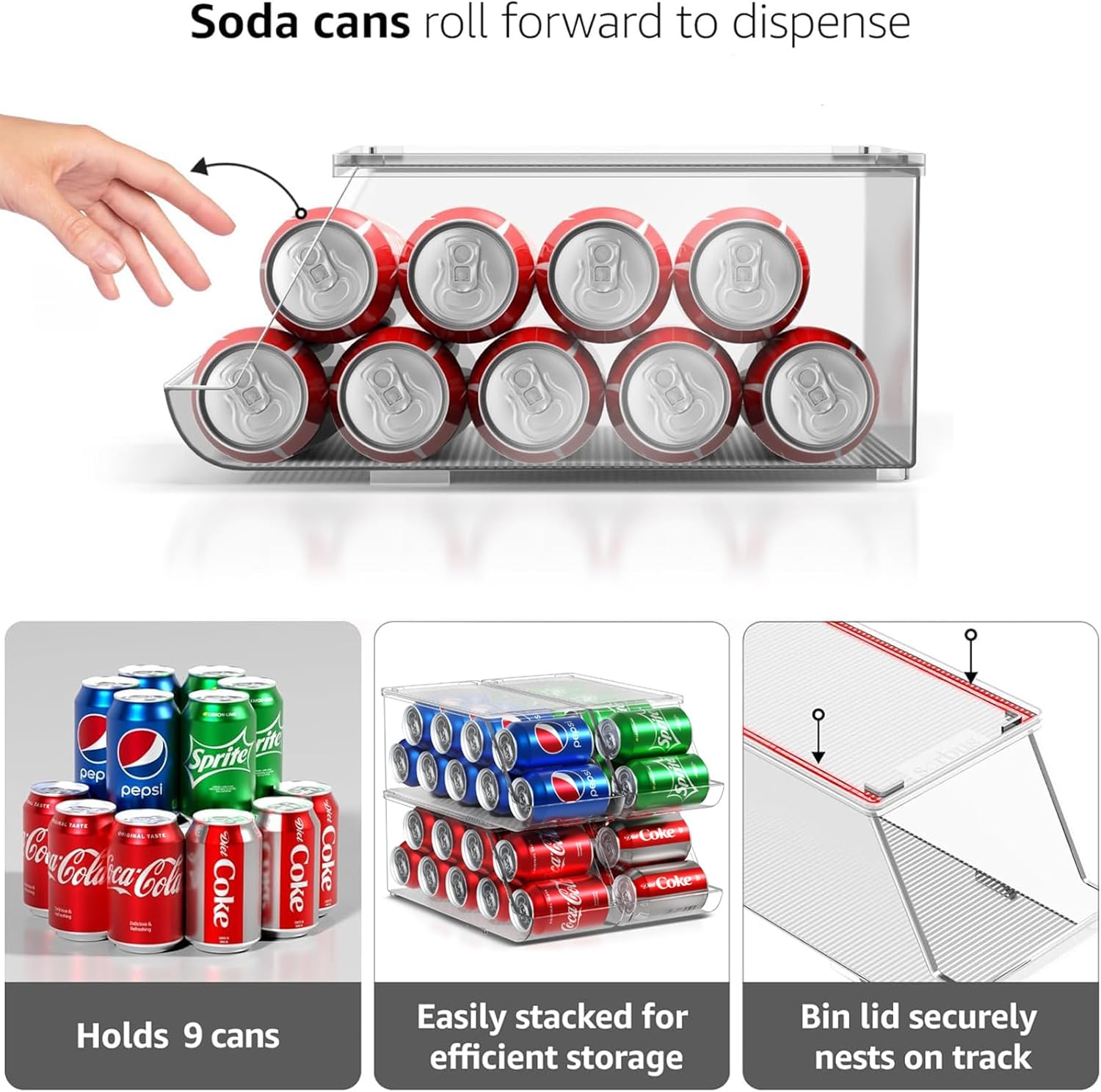 Sorbus Soda Can Organizer for Refrigerator - Stackable Can Holder Dispenser with Lid for Fridge, Pantry, Freezer – Holds 9 Cans Each, BPA-Free, Clear Design, Drink Organizer for Fridge (4-Pack)