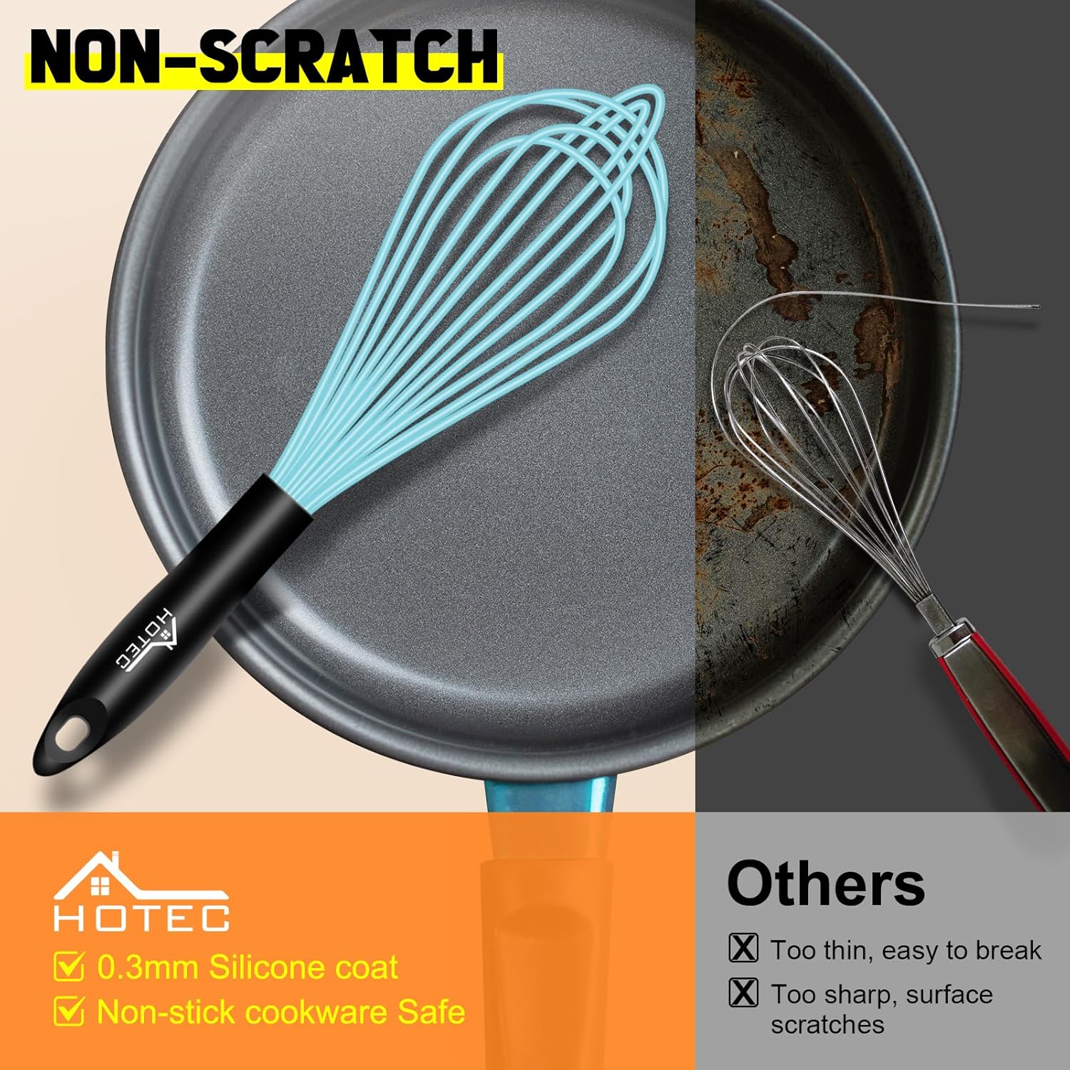 - Hotec silicone whisk is made of sturdy stainless steel wire which coated with food-grade silicone.Softer and more flexible silicone material not scratch your pots, pans, or bakeware